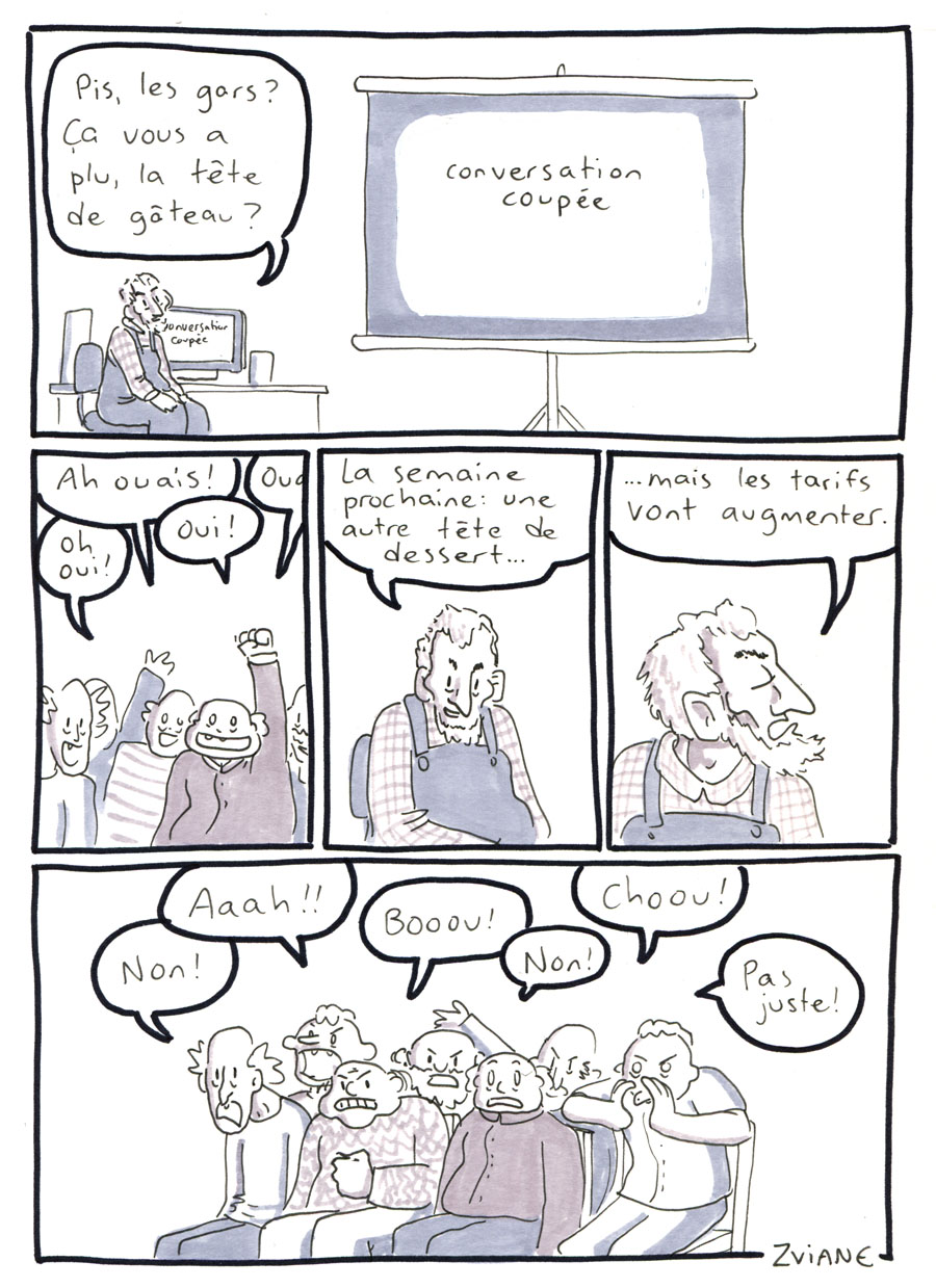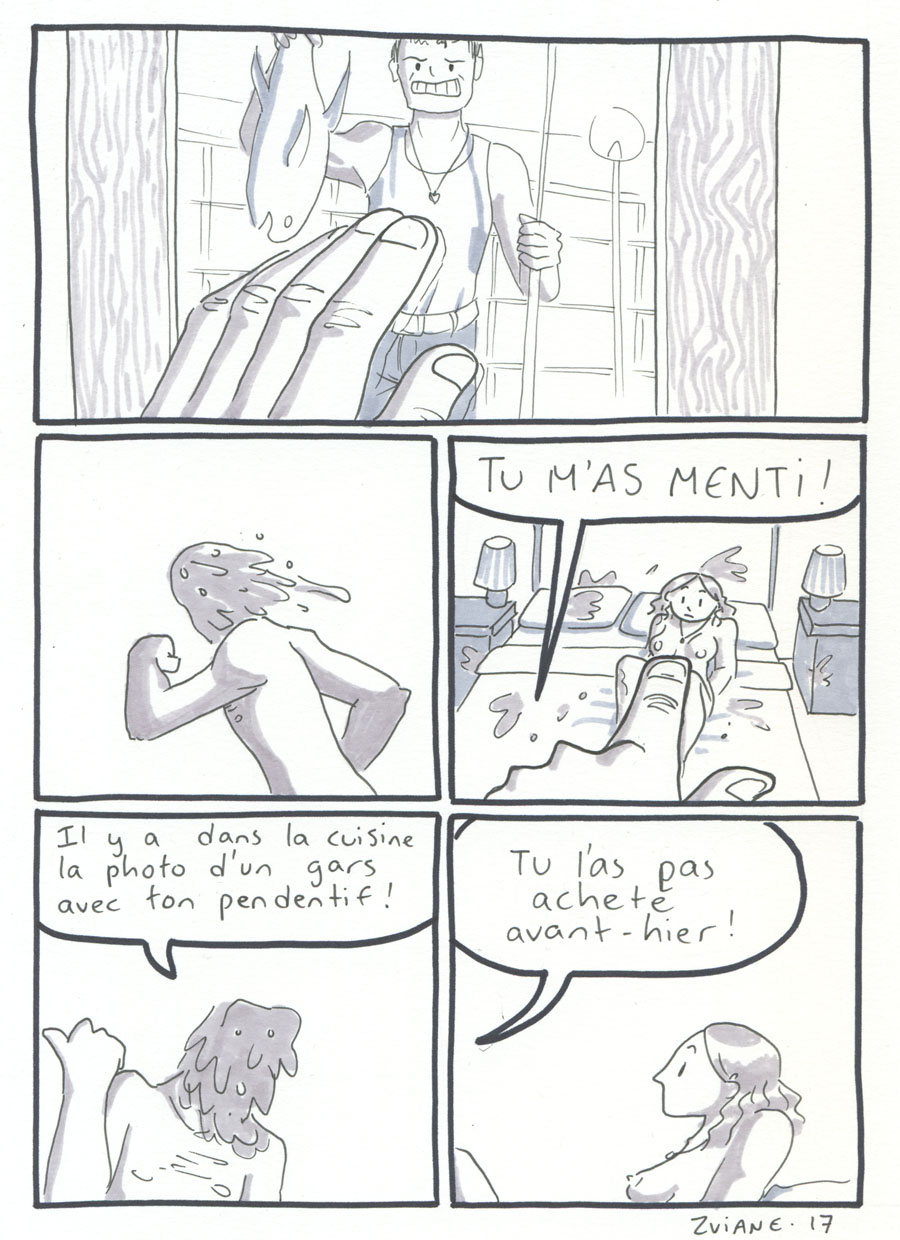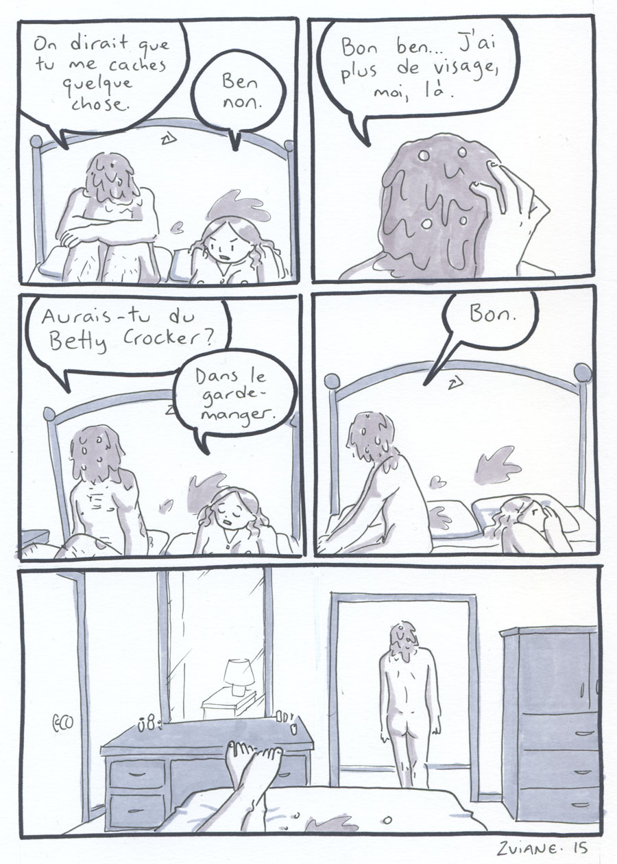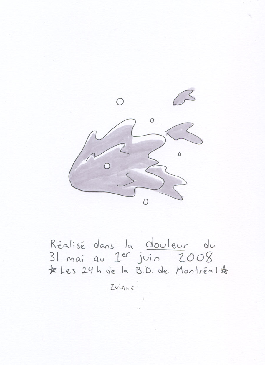 On a organisé les 24h de la BD de montréal, avec Julie Delporte et Christophe Magnette. C'est ma participation. Il fallait ploguer une photo trouvée, d'un gars qui montre un poisson qu'il vient de pêcher. On a fait ça dans les locaux de CHOQ fm dans le temps où c'était sur Sainte-Catherine, et on collait nos pages terminées dans la vitrine au fur et à mesure qu'on les finissait. Il y avait un marathon de radio en même temps. Beaux souvenirs.