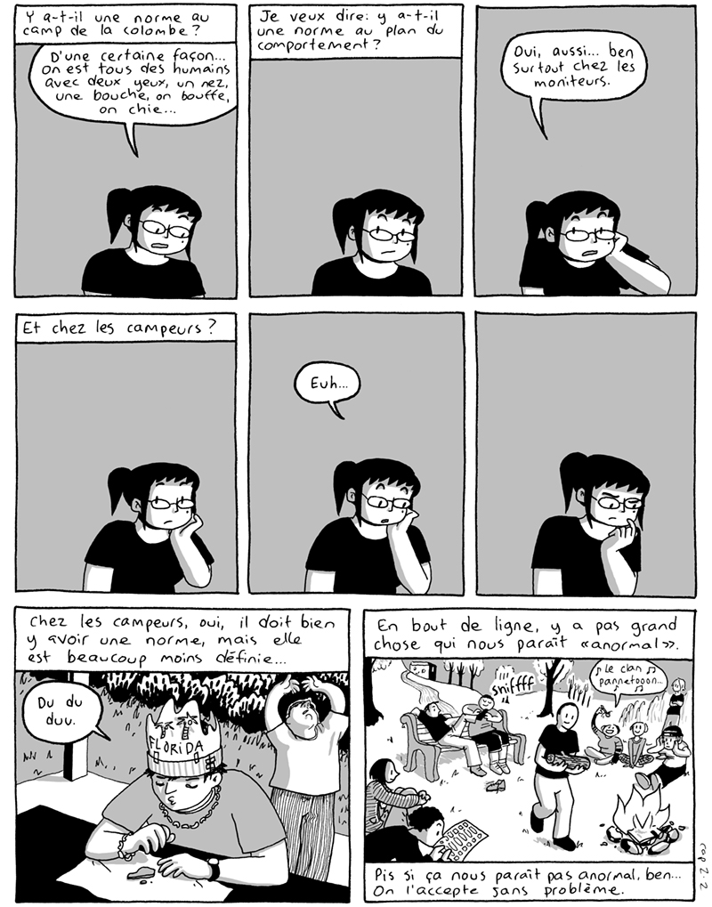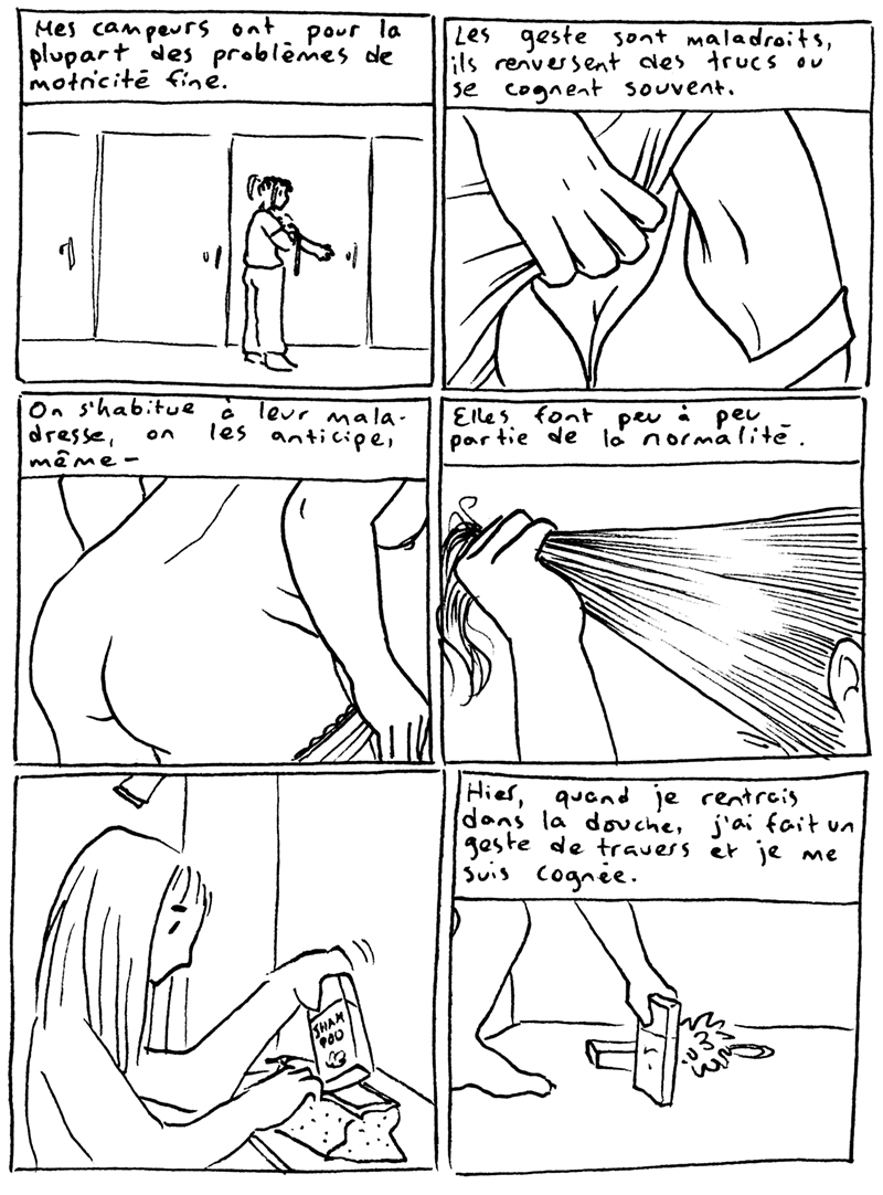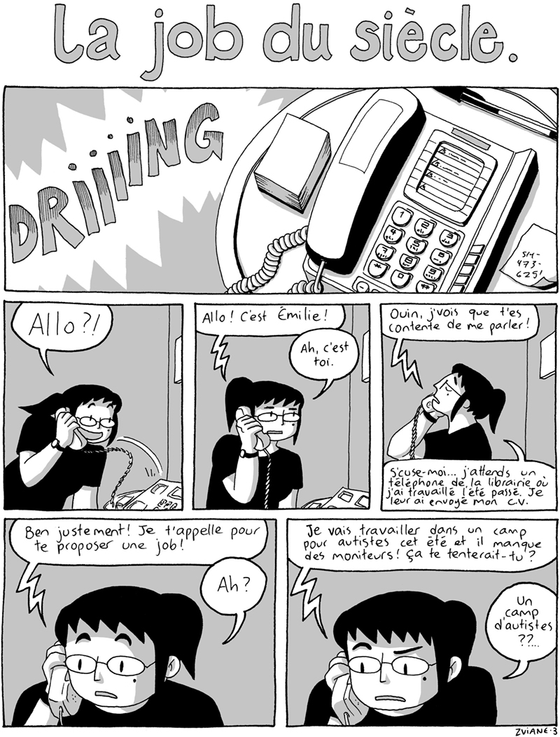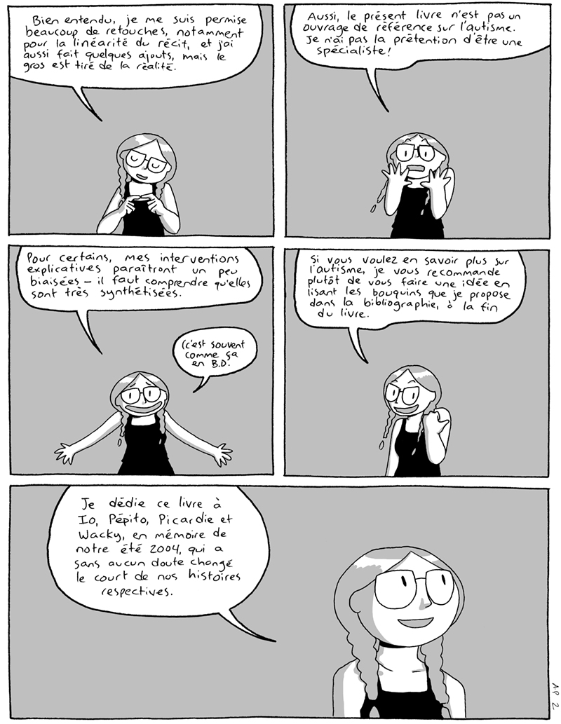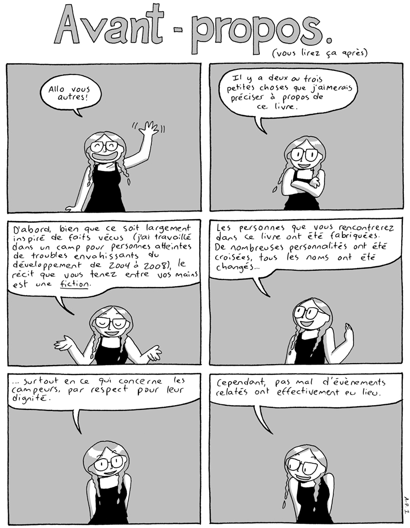 C'était la BD sur laquelle je travaillais quand j'étais en résidence à la maison des auteurs d'Angoulême. C'était basé sur mon expérience de monitrice dans un camp d'été pour autistes. J'ai scénarisé beaucoup, beaucoup, beaucoup de pages, et finalement je me suis rendue compte que j'allais pas du tout dans la bonne direction. J'ai fini par tout mettre dans le congélateur.