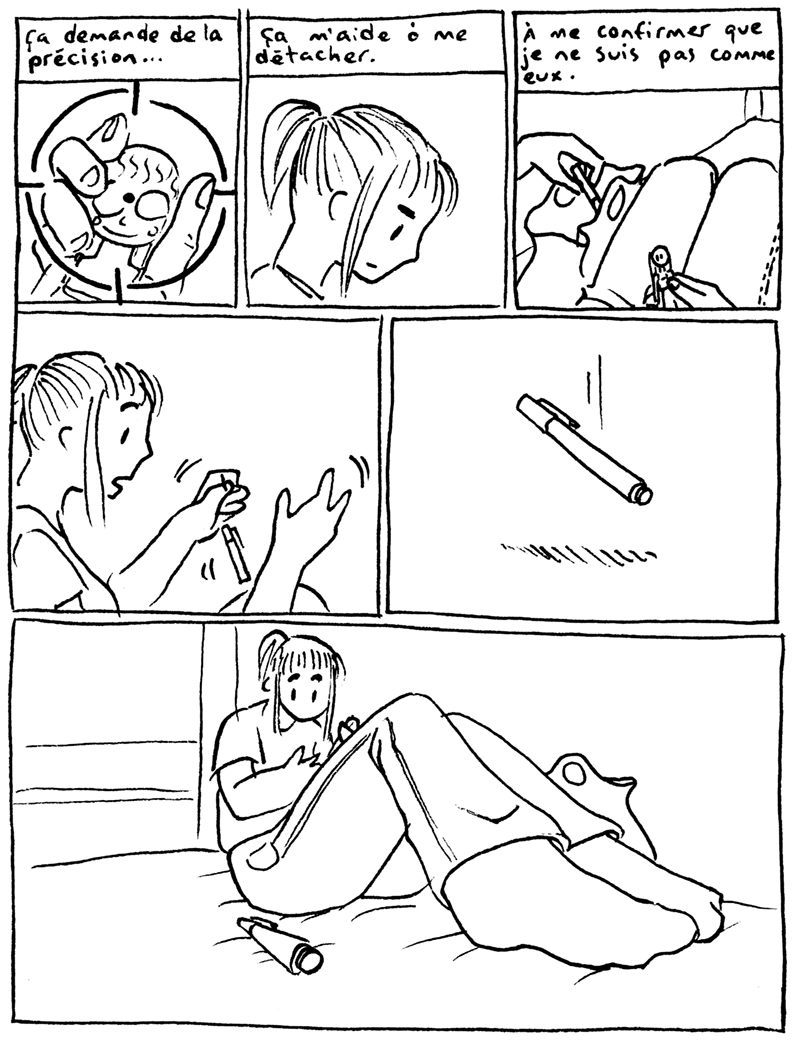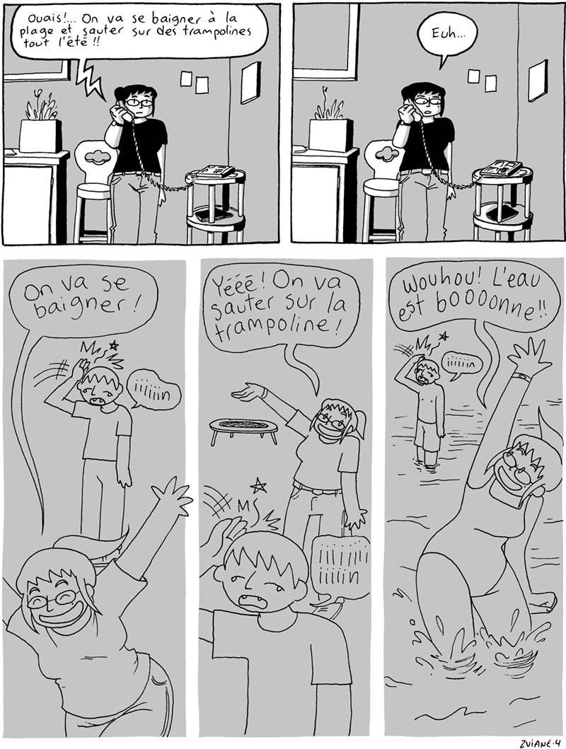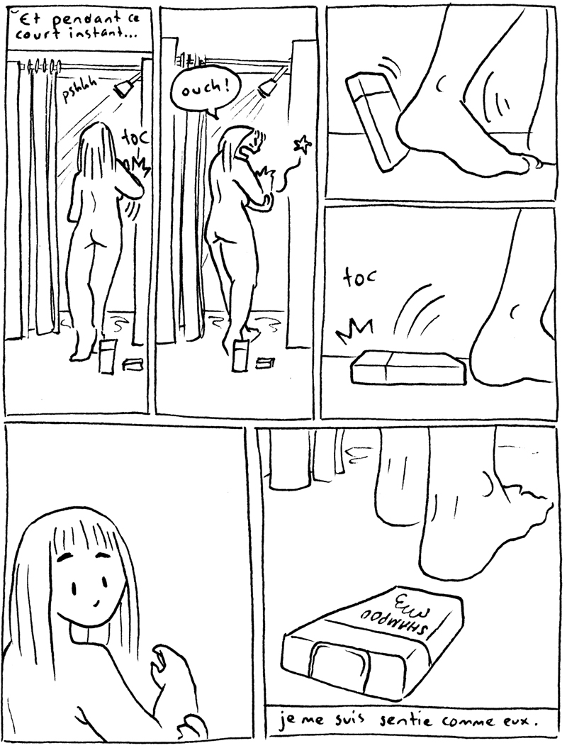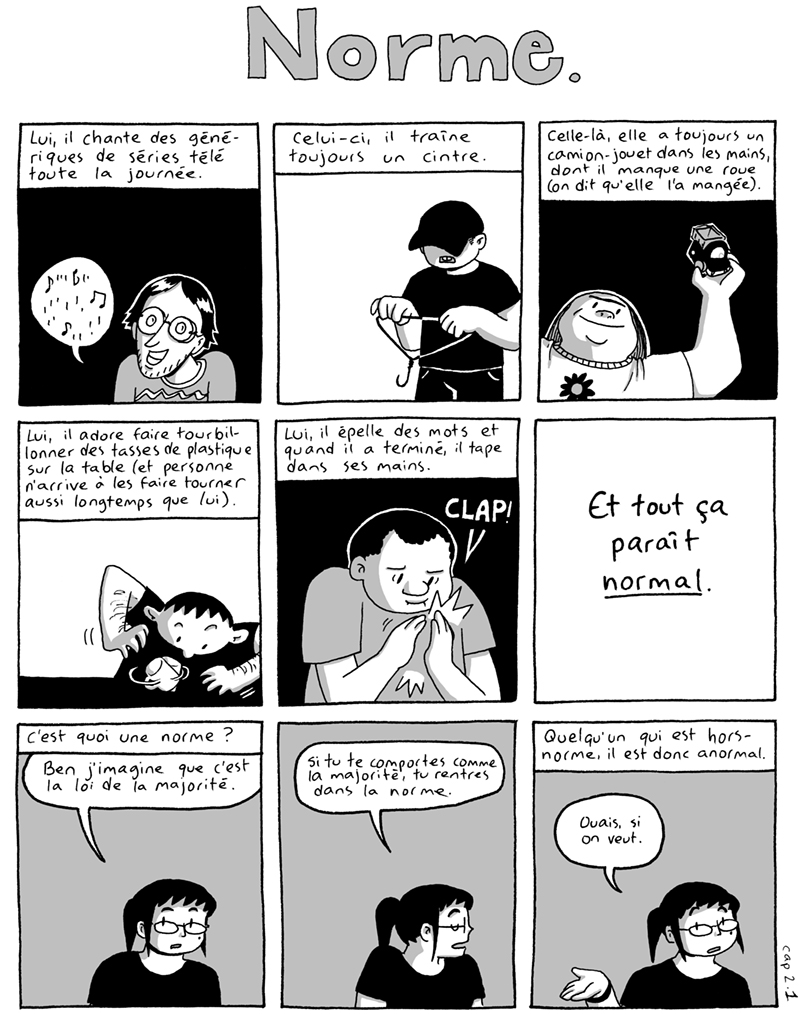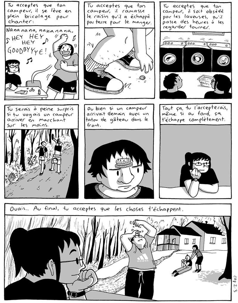 C'était la BD sur laquelle je travaillais quand j'étais en résidence à la maison des auteurs d'Angoulême. C'était basé sur mon expérience de monitrice dans un camp d'été pour autistes. J'ai scénarisé beaucoup, beaucoup, beaucoup de pages, et finalement je me suis rendue compte que j'allais pas du tout dans la bonne direction. J'ai fini par tout mettre dans le congélateur.