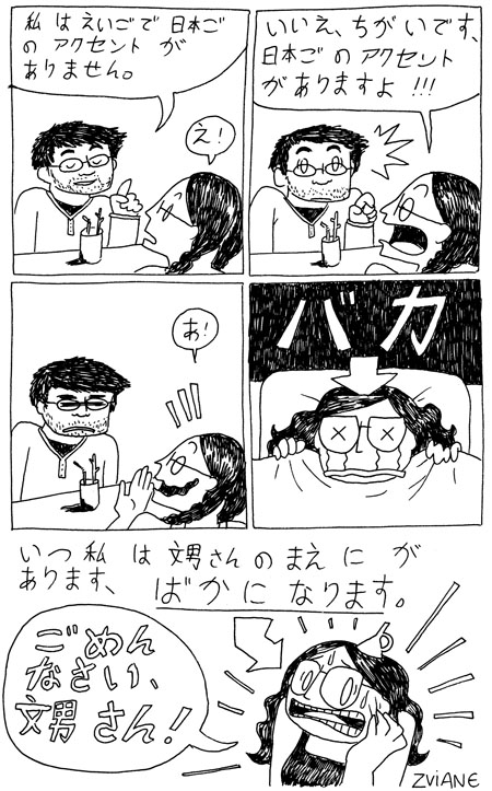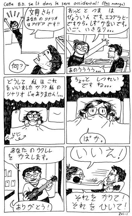 Quand quelqu'un finissait sa résidence à la maison des auteurs d'Angoulême, on lui faisait toujours une petite fête, et parfois un petit zine. Fumio partait. Il m'avait donné des cours de japonais. C'est ma petite BD pour le départ de Fumio, dans un japonais exécrable.