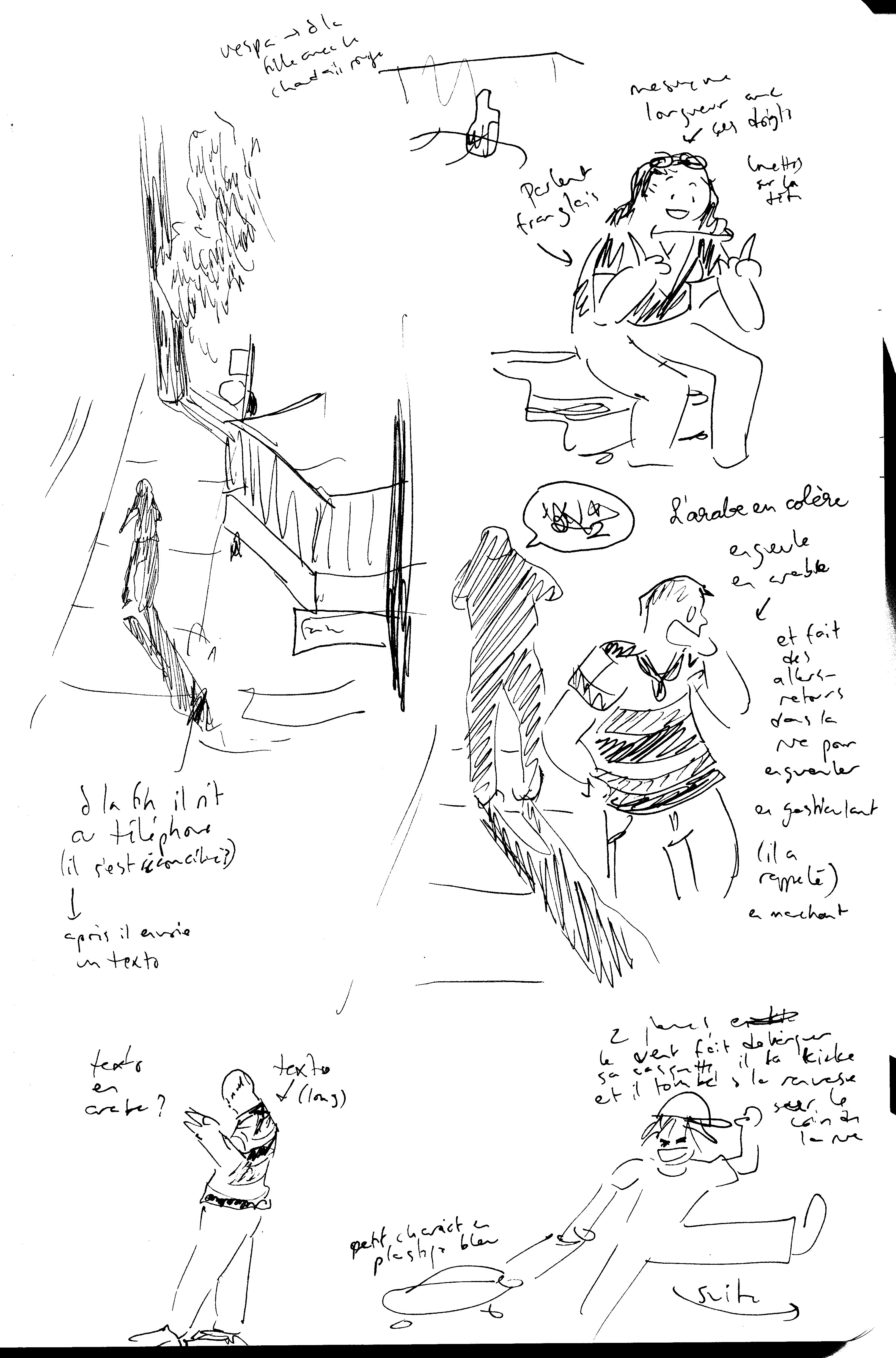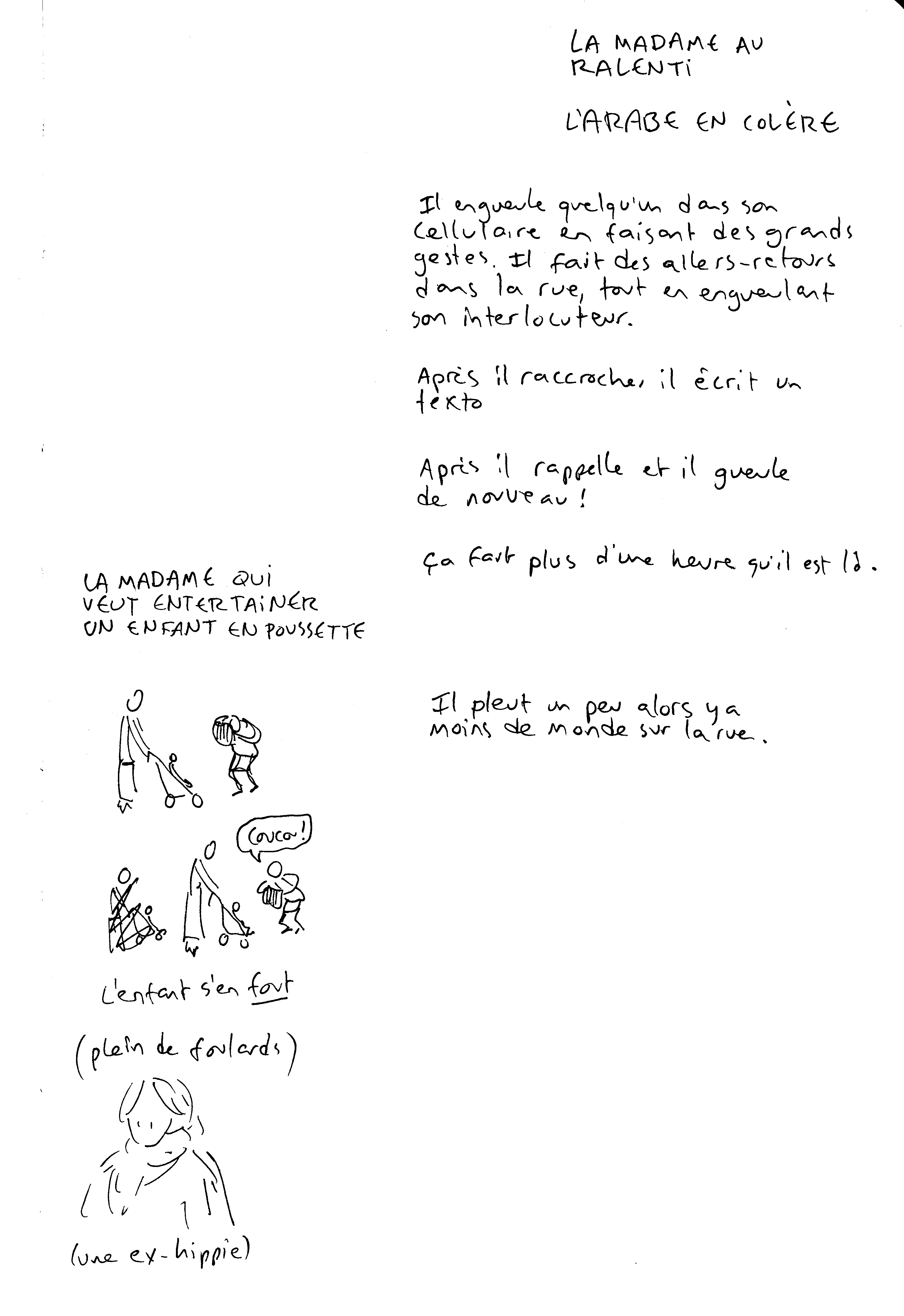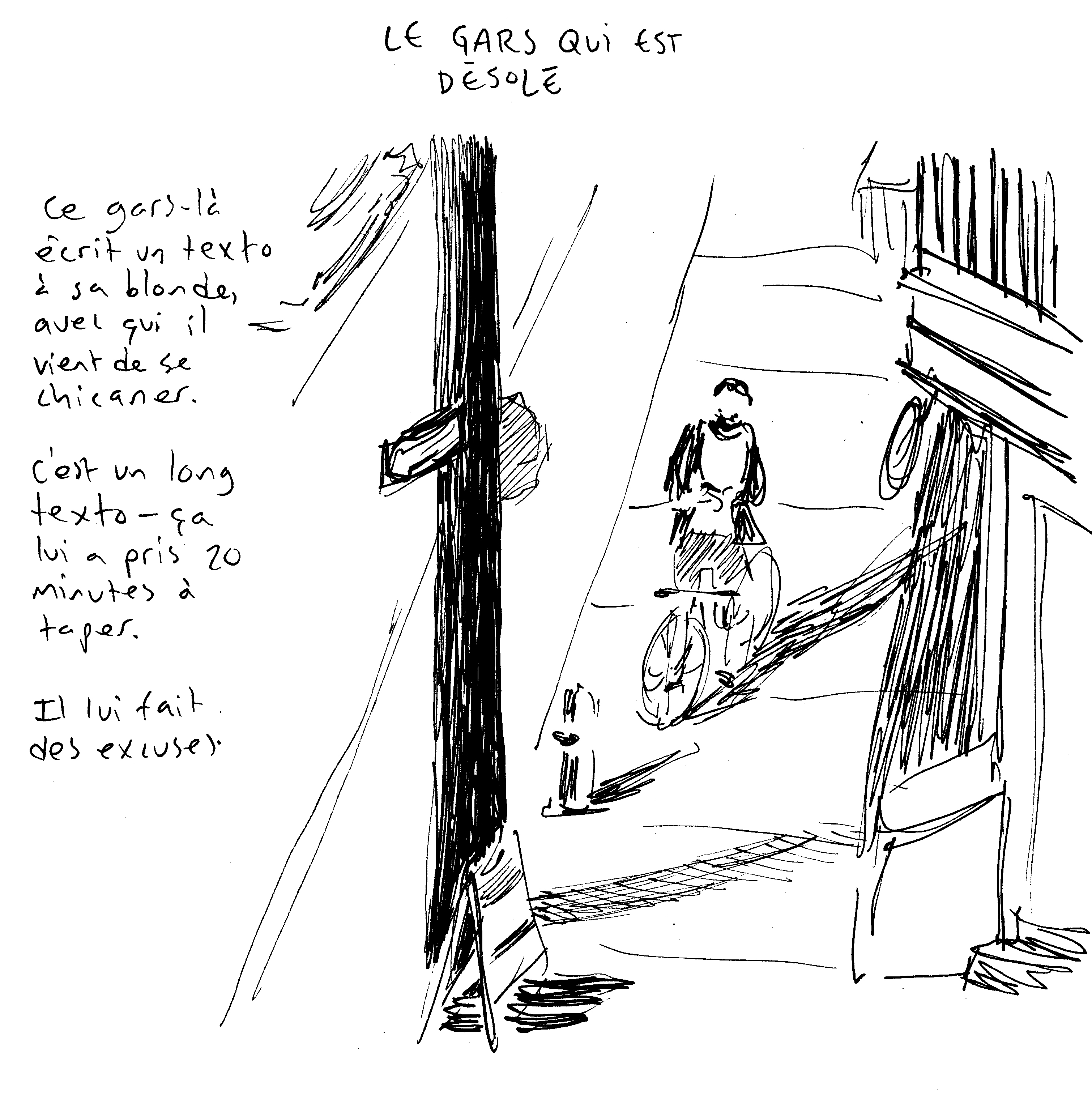 Hahahah ça c'était un projet qui a jamais vraiment fleuri, que je faisais avec Michel Hellman. On allait s'asseoir sur son balcon dans le mile-end, un balcon mythique en-dessous duquel il se passe tout le temps dix mille affaires, puis on les dessinait, on les scannait, et on les mettait sur un blog. Il y a eu une couple de séances. J'attends encore après les pages de Michel.