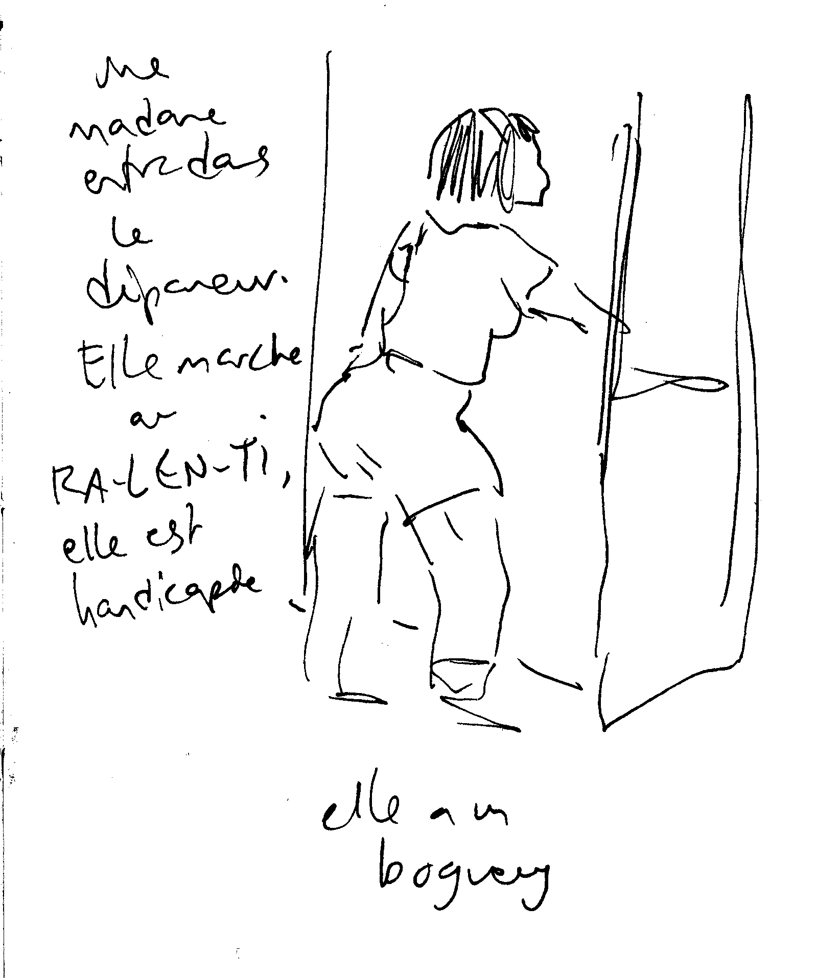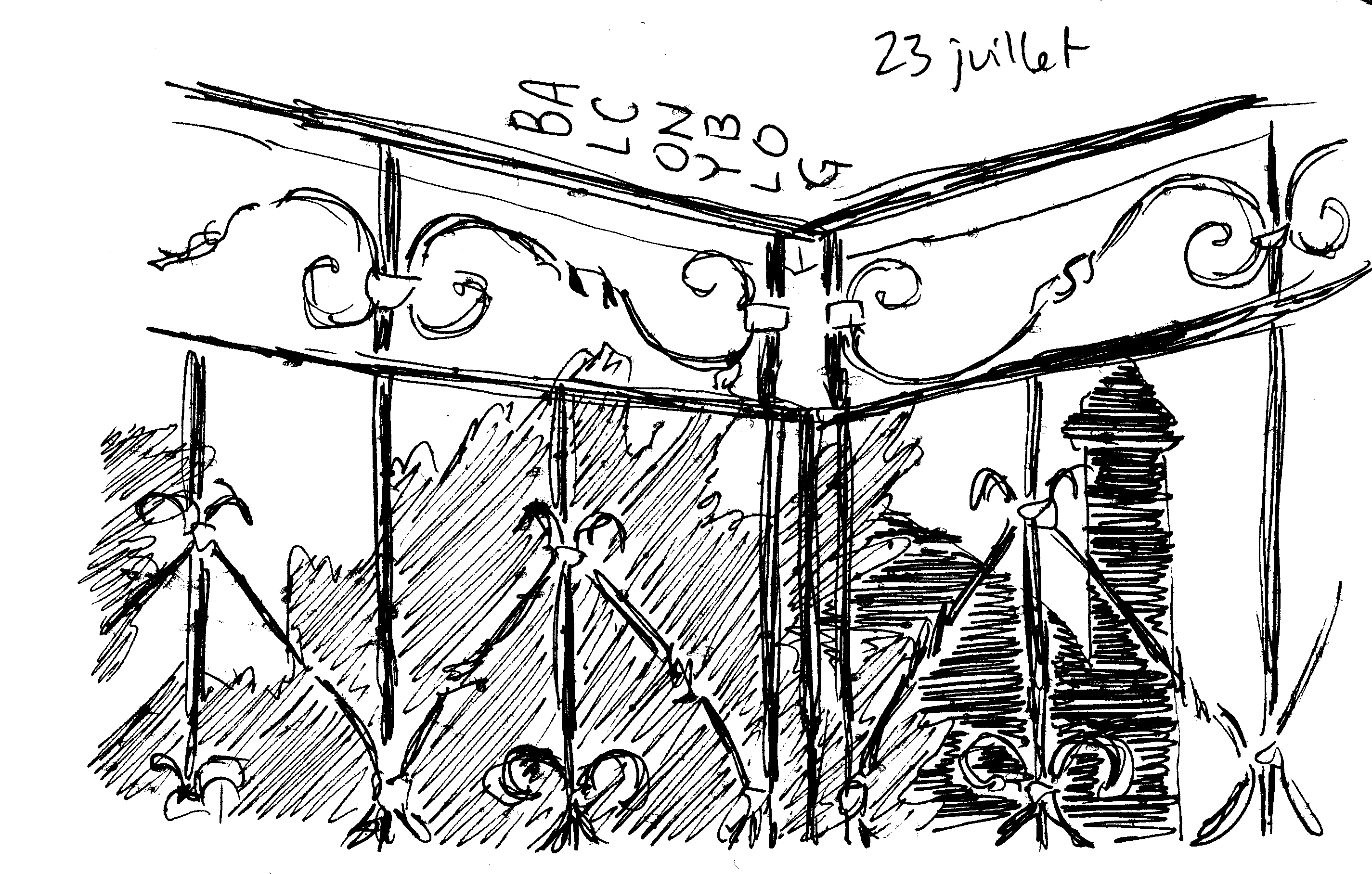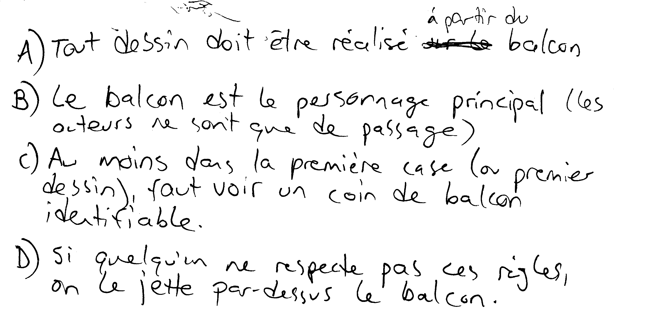 Hahahah ça c'était un projet qui a jamais vraiment fleuri, que je faisais avec Michel Hellman. On allait s'asseoir sur son balcon dans le mile-end, un balcon mythique en-dessous duquel il se passe tout le temps dix mille affaires, puis on les dessinait, on les scannait, et on les mettait sur un blog. Il y a eu une couple de séances. J'attends encore après les pages de Michel.