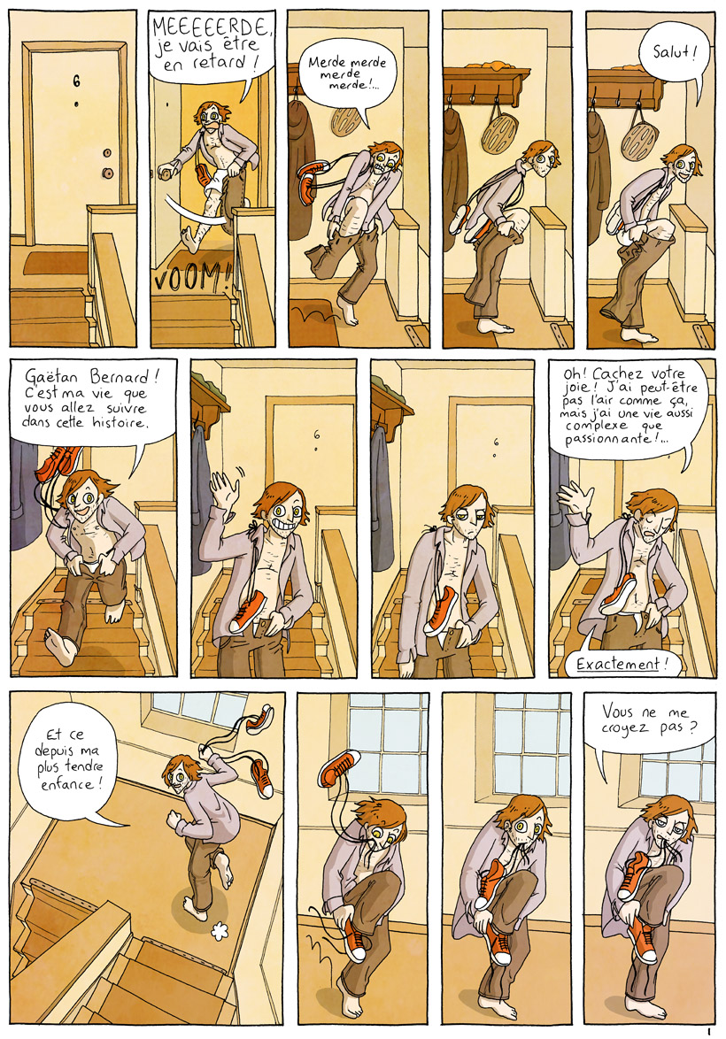 Je me suis fait approcher par un scénariste qui avait aimé mon dessin dans le recueil de Glénat québec, Histoires d'hiver. C'était une gig payante: dessiner une série, publiée chez genre Dupuis, si ma mémoire est bonne. Le scénario, qui avait déjà été acheté par la maison d'édition, me plaisait plus ou moins. J'avais fait des meetings skype avec le gars (un français, très smatt) et il avait même accepté de changer des affaires. Je lui ai pondu ces trois pages test (affreuses!) et finalement il ne m'ont pas retenue pour le dessin. Je me souviens plus si j'ai été payée?...En tout cas une couple d'années plus tard, dans une librairie, j'ai vu un album de la série dessiné par quelqu'un d'autre, c'était pas mal beau.