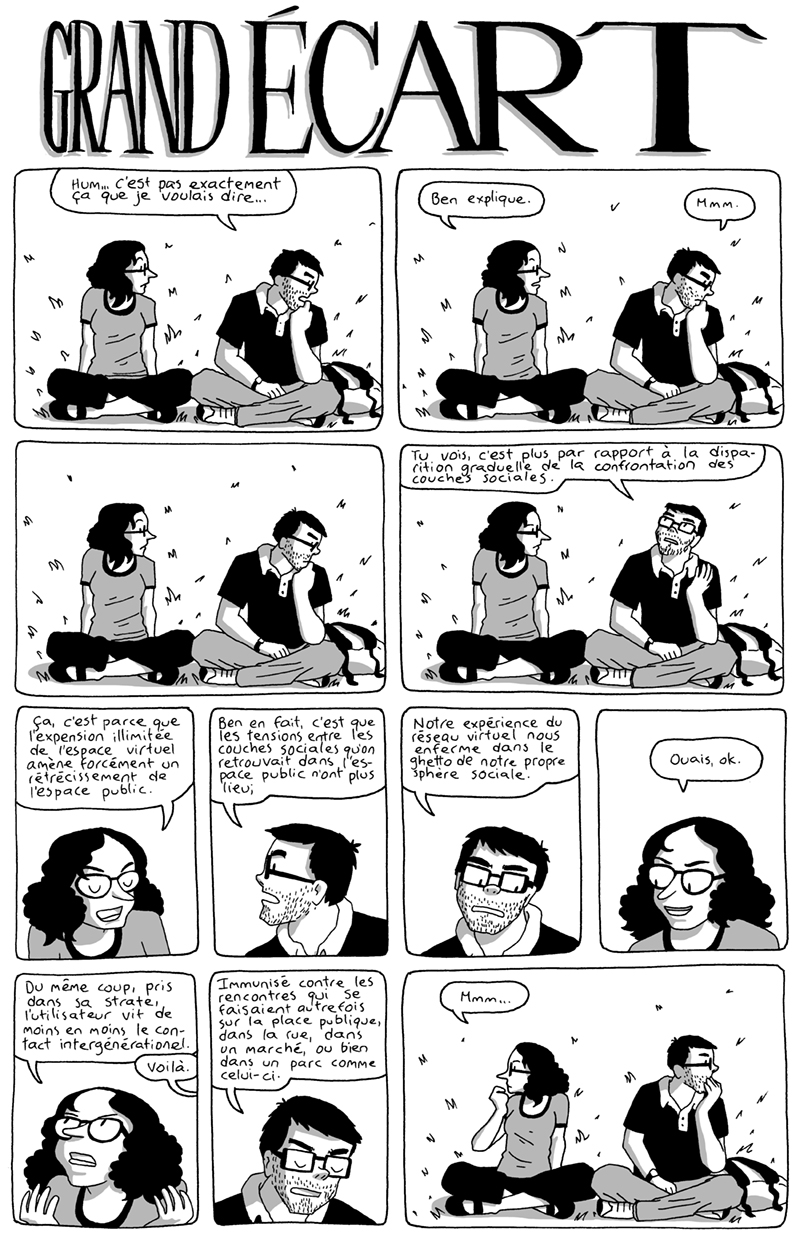 BD pour un collectif, dirigé par je me rappelle plus qui, je ne sais plus pour quel événement??... je me rappelle du petit zine que ça a produit. C'était plein de BD qui tournaient autour des grosses sculptures qu'il y a dans le parc émilie gamelin, construites par l'artiste Melvin Charney.