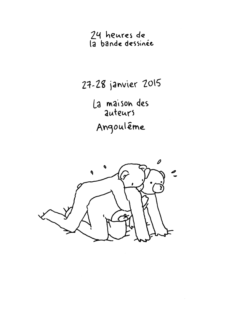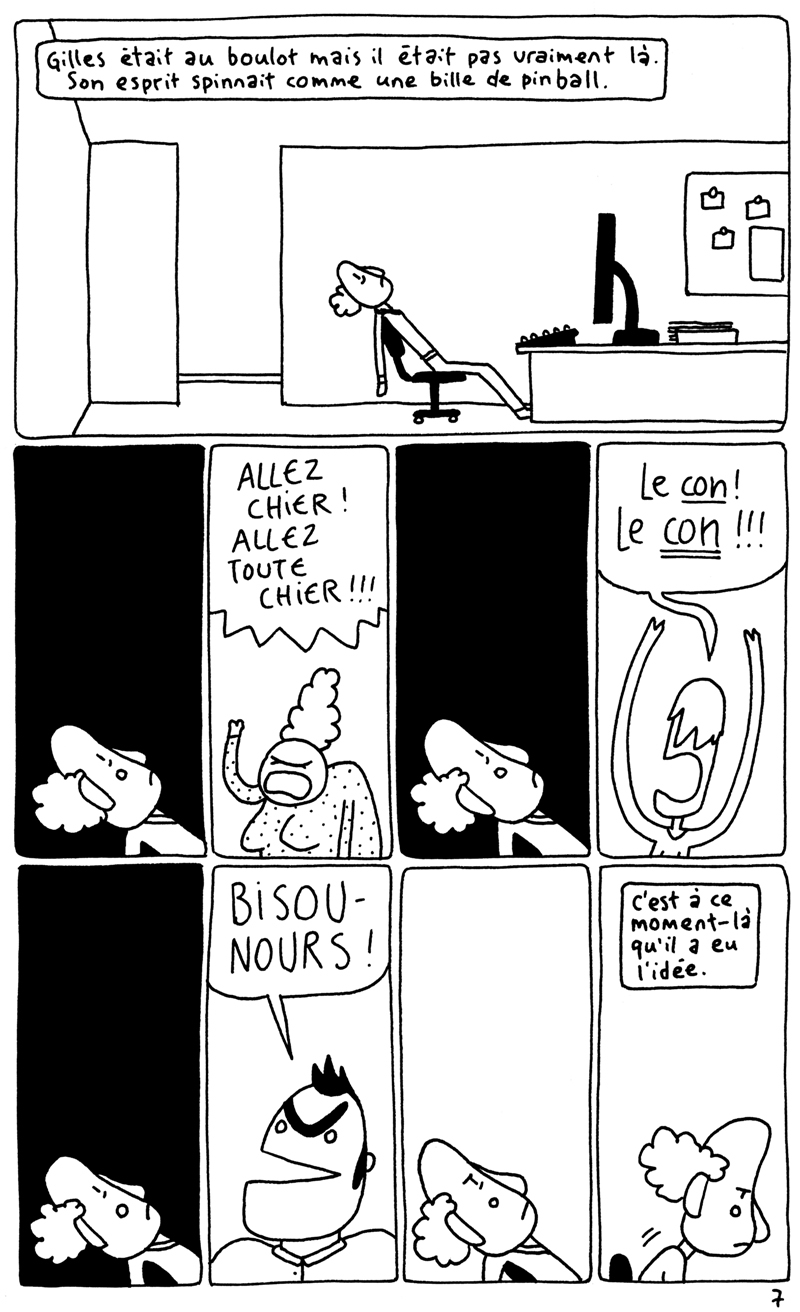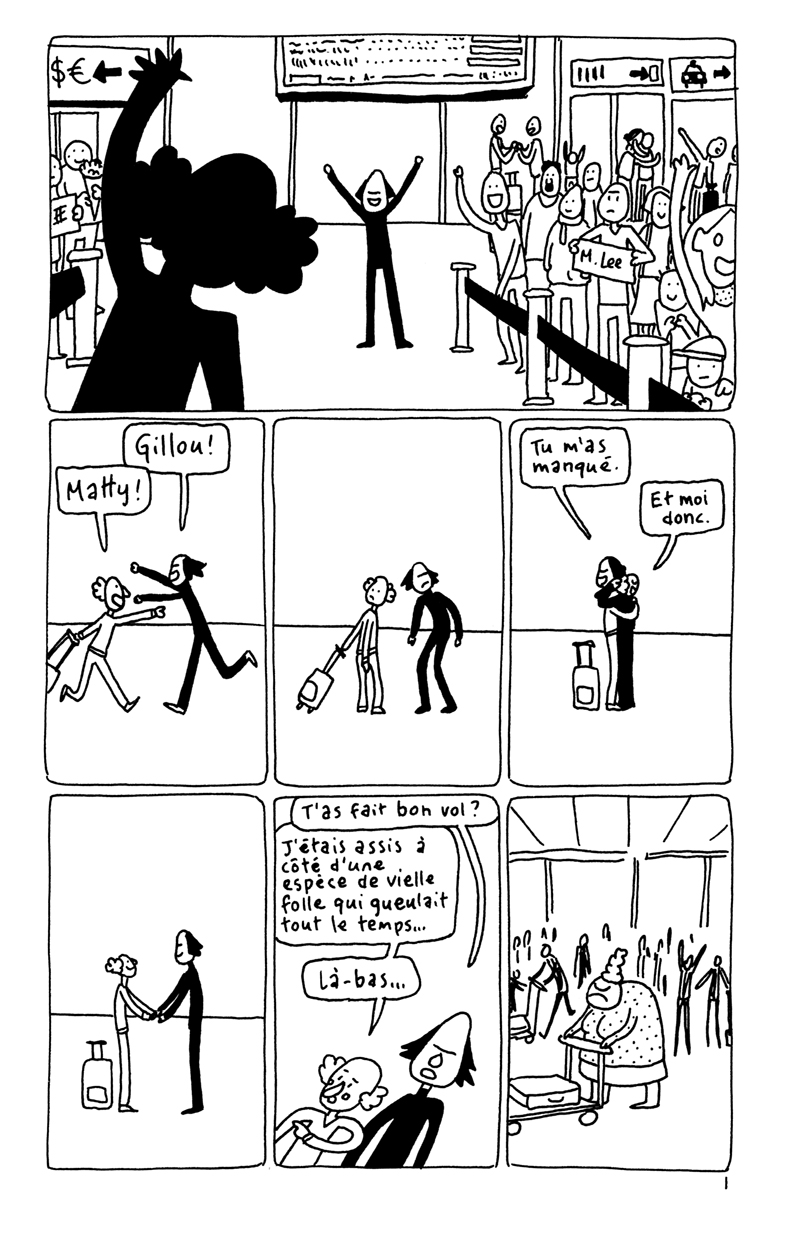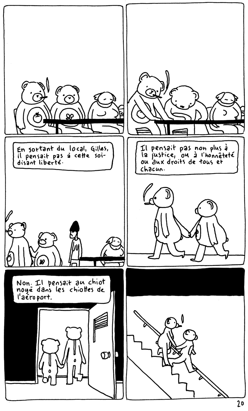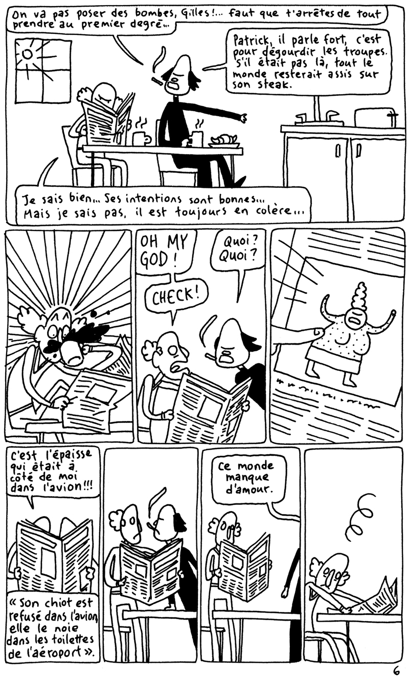 Les 24h de la BD d'Angoulême, fait sur place à la maison des auteurs. La contrainte était chiante. Elle partait d'un fait divers macabre (un madame qui noie son chien dans un aéroport), et on nous imposait de faire une case muette sur deux. Ça donne un rythme bancal. J'aime pas trop cette BD. (il manque la couve??) (il manque la page 5?????)