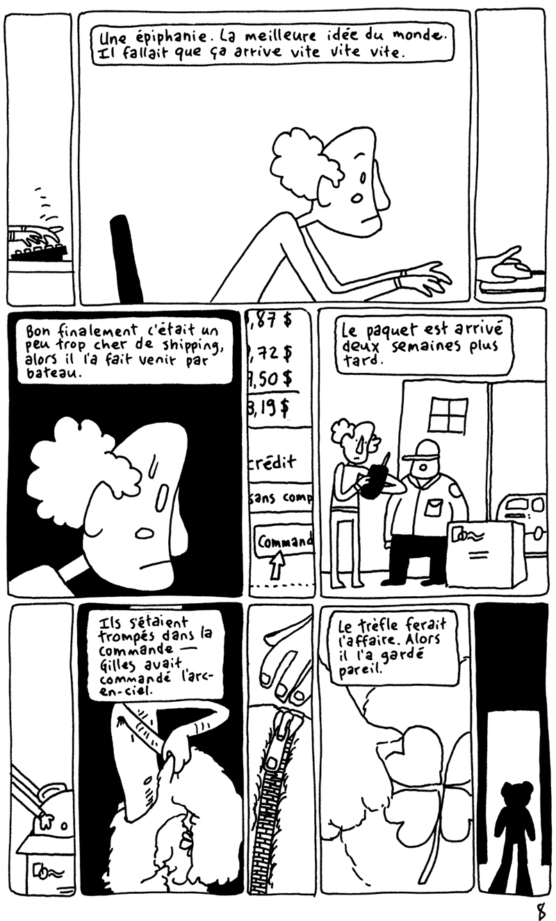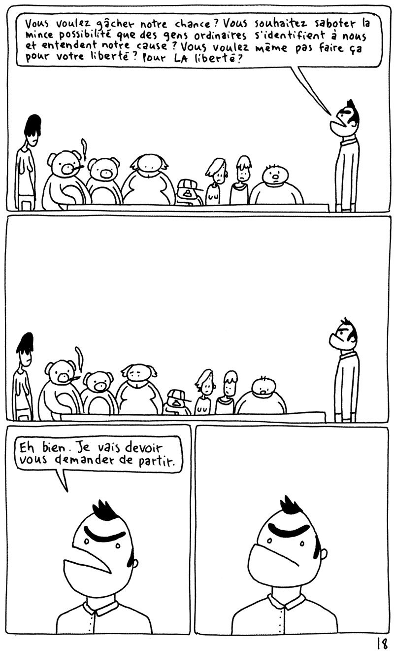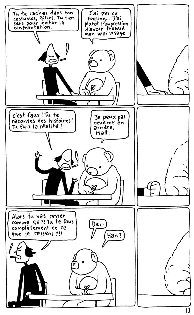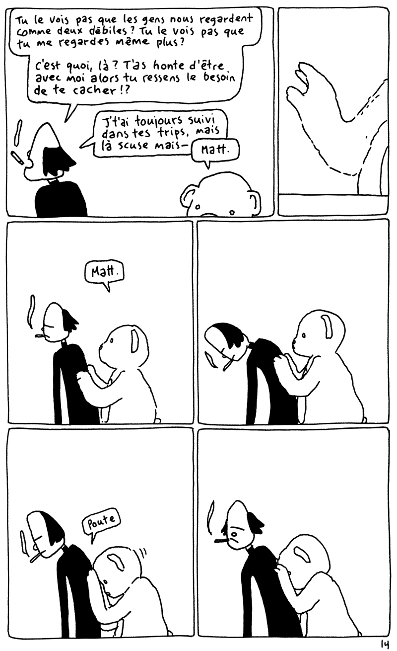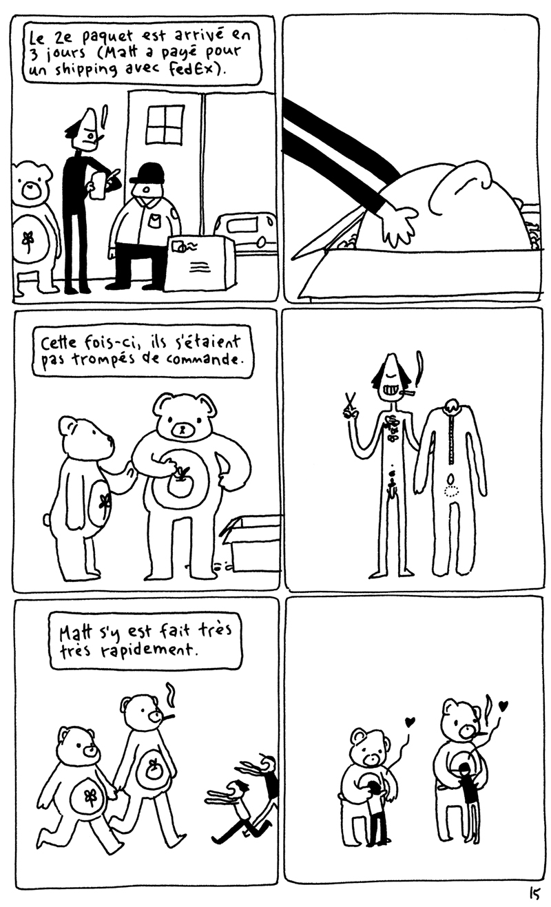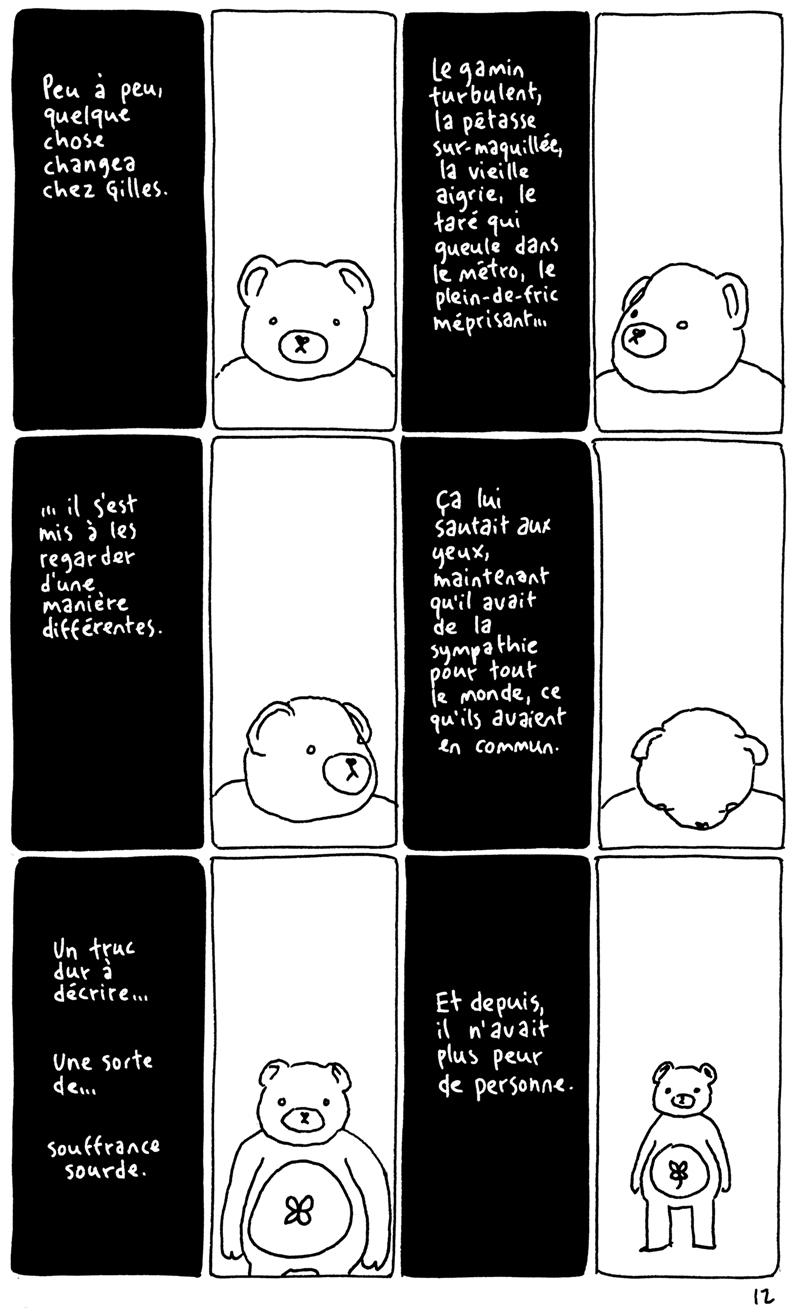 Les 24h de la BD d'Angoulême, fait sur place à la maison des auteurs. La contrainte était chiante. Elle partait d'un fait divers macabre (un madame qui noie son chien dans un aéroport), et on nous imposait de faire une case muette sur deux. Ça donne un rythme bancal. J'aime pas trop cette BD. (il manque la couve??) (il manque la page 5?????)