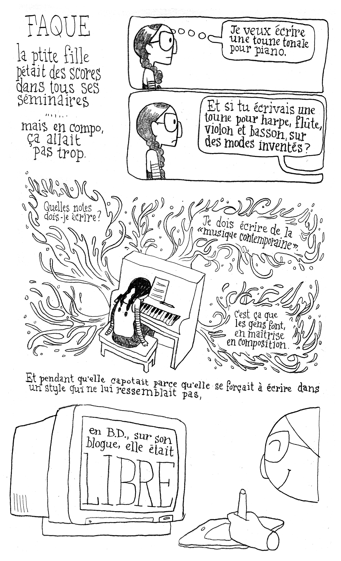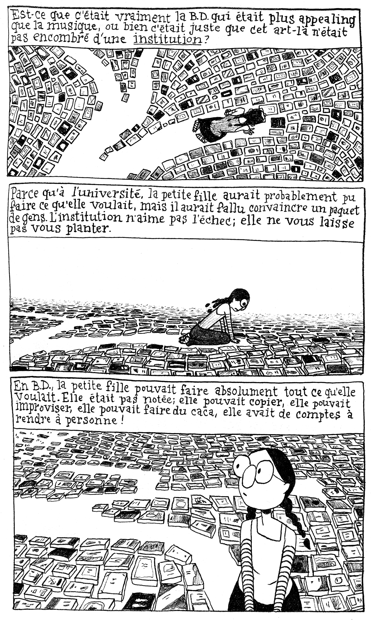 C'est une réédition de deux livres, La plus jolie fin du monde et Le quart de millimètre, en un seul livre. Mais les deux livres ont trois cent pages et À l'école a aussi 300 pages, ça veut dire que 300 pages ont été coupées. Bref, c'est un recueil de notes de blogue, à l'époque où j'étudiais en musique.