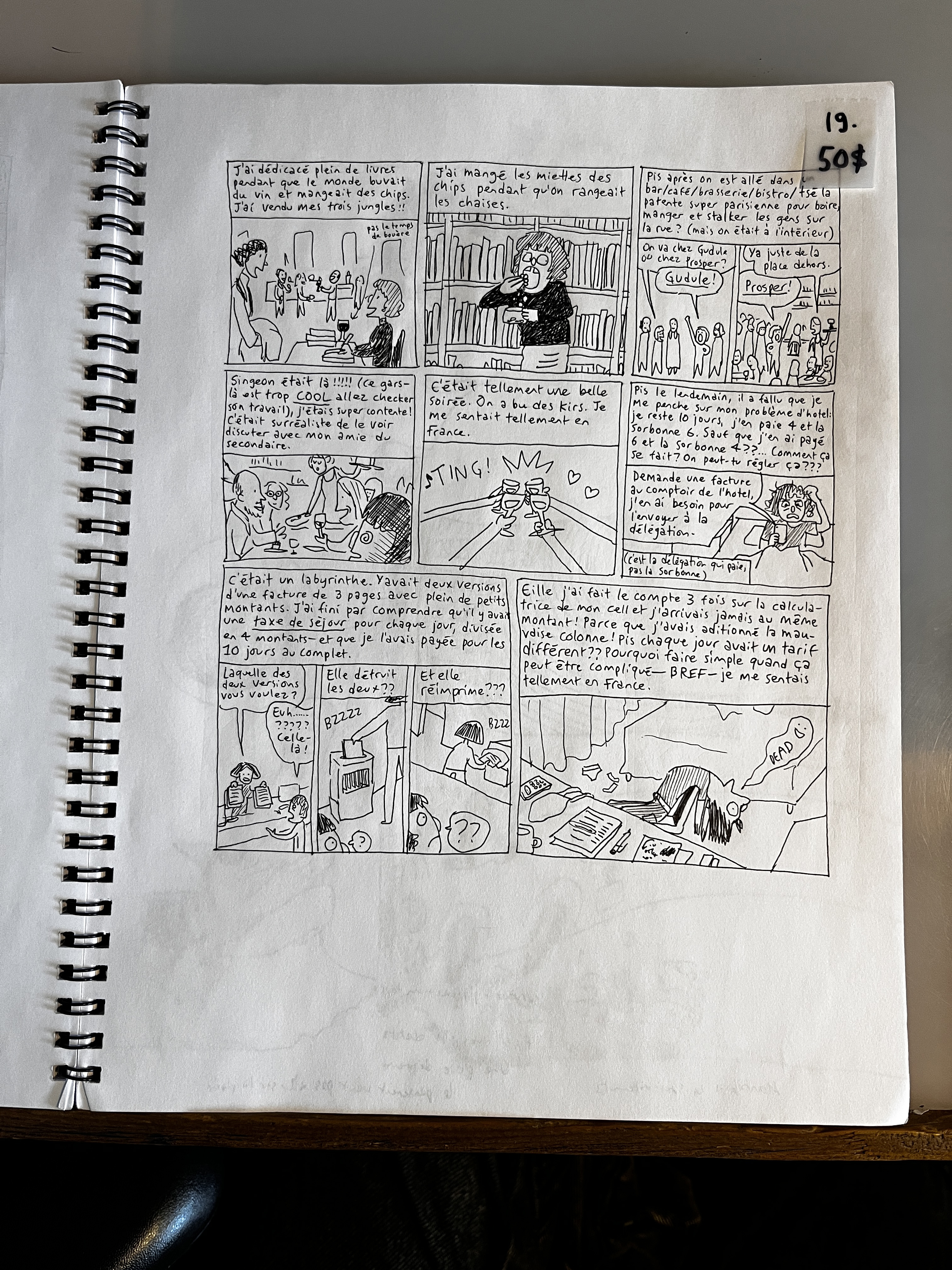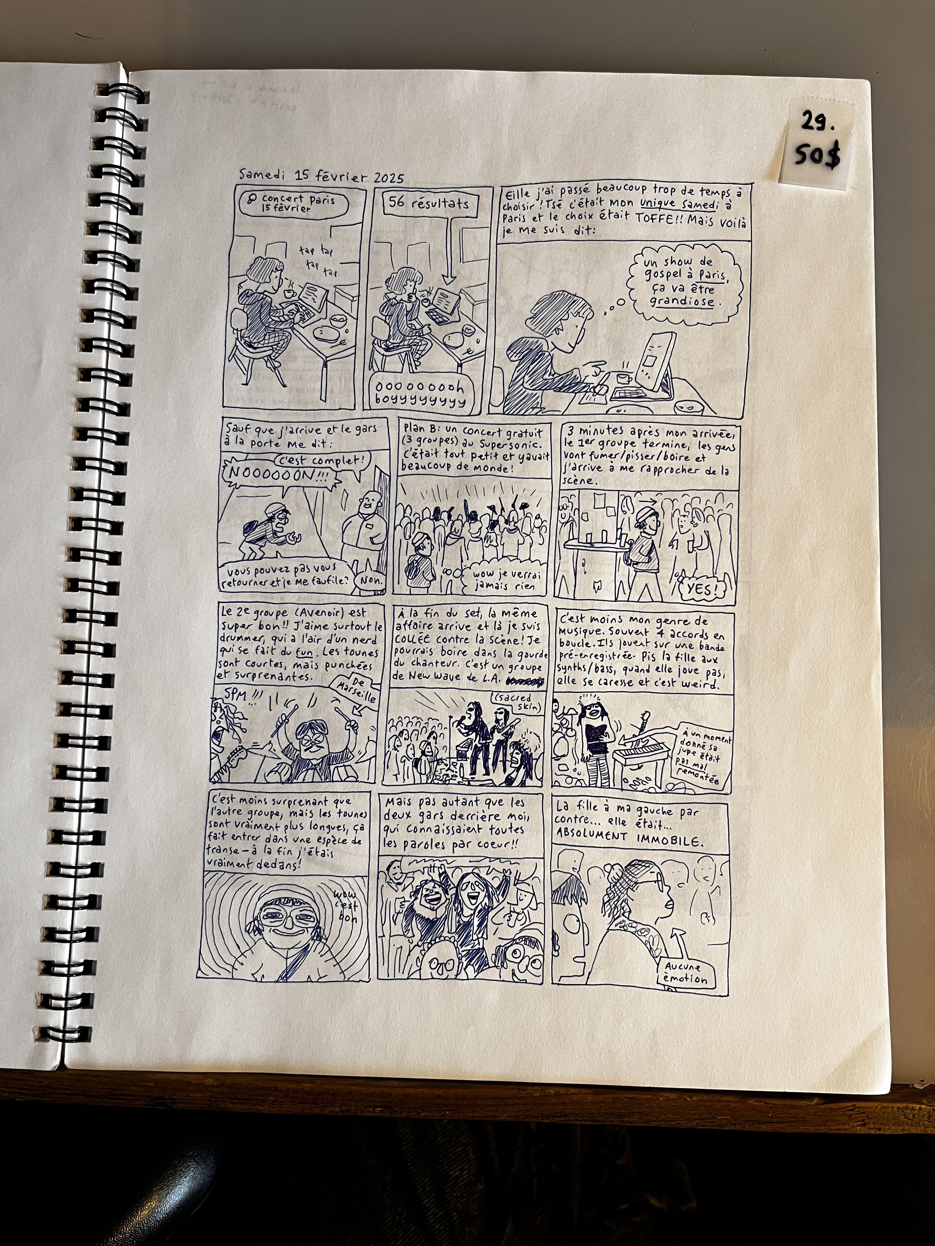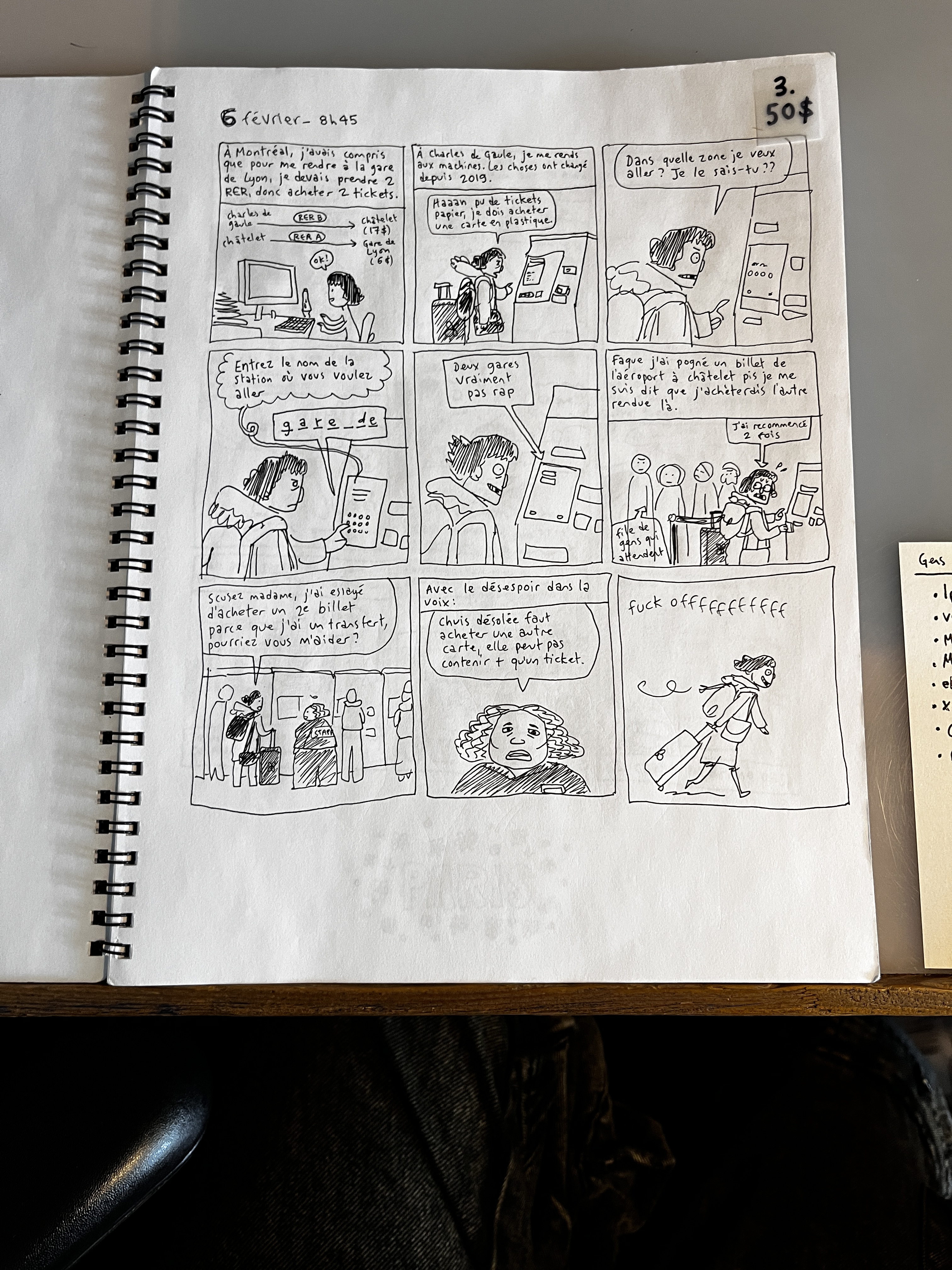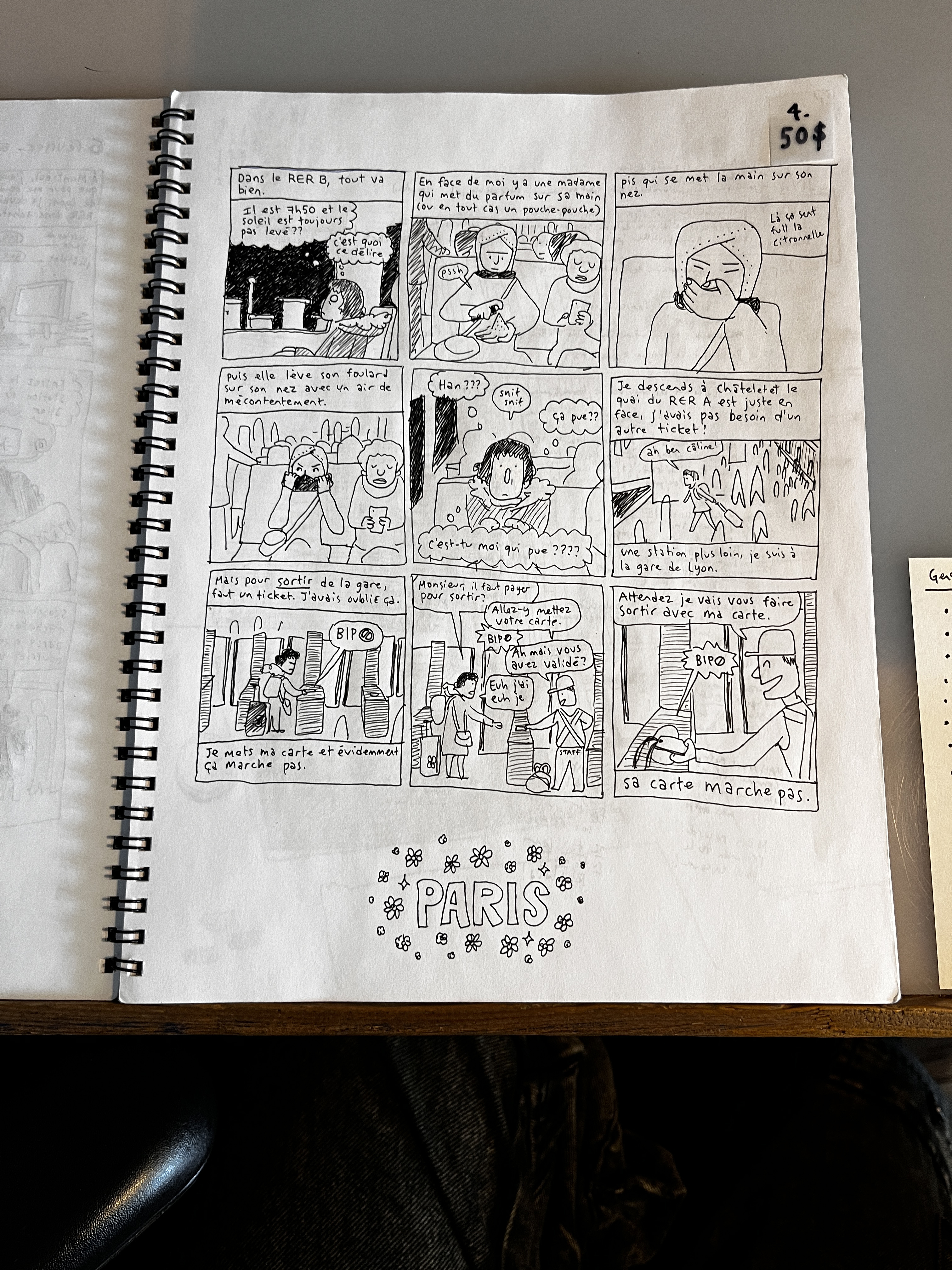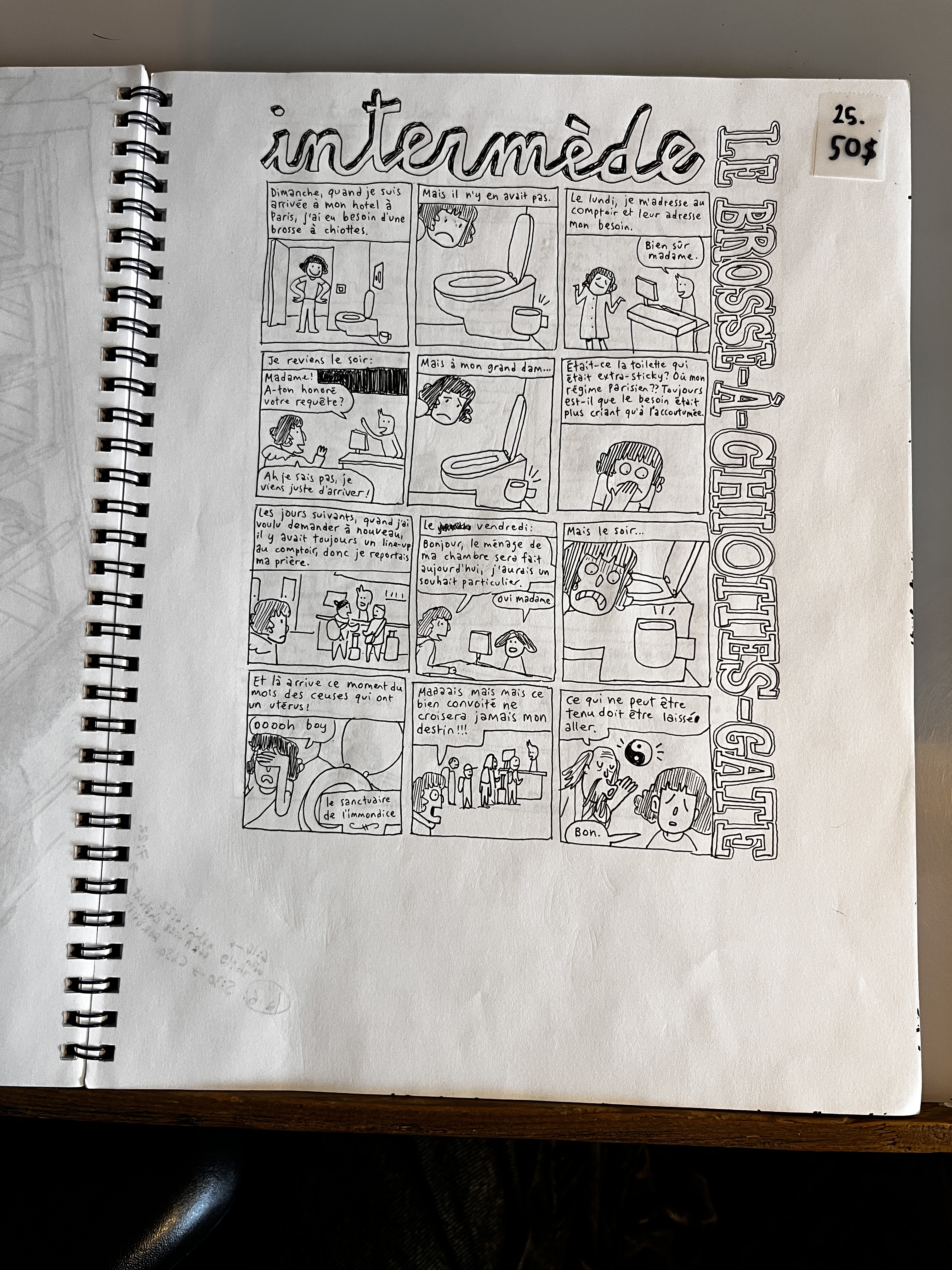 Mon projet de film a chié, donc je me suis remise à faire de la BD. Ça c'est mon journal de voyage quand j'étais à Paris. J'ai fait quelques pages aussi à Los Angeles, mais c'est plus des dessins, j'avais pas trop le temps de faire de BD. J'ai pogné toutes les pages de Paris et j'en ai fait un zine. Aucune page n'a été scannée, le zine est fait entièrement à la photocopieuse - pis j'ai collé des ornements que j'ai trouvé dans des vieilles affaires.