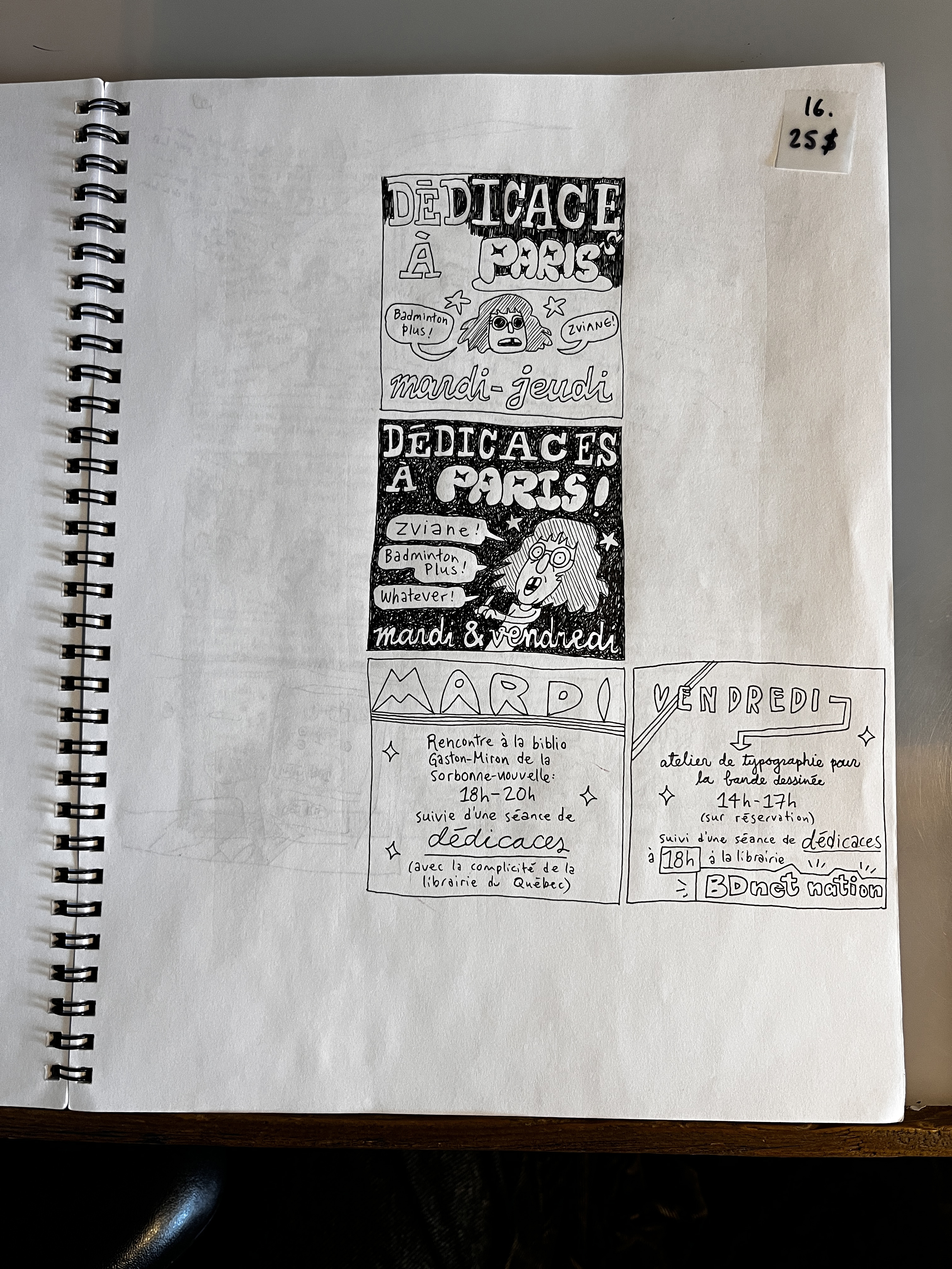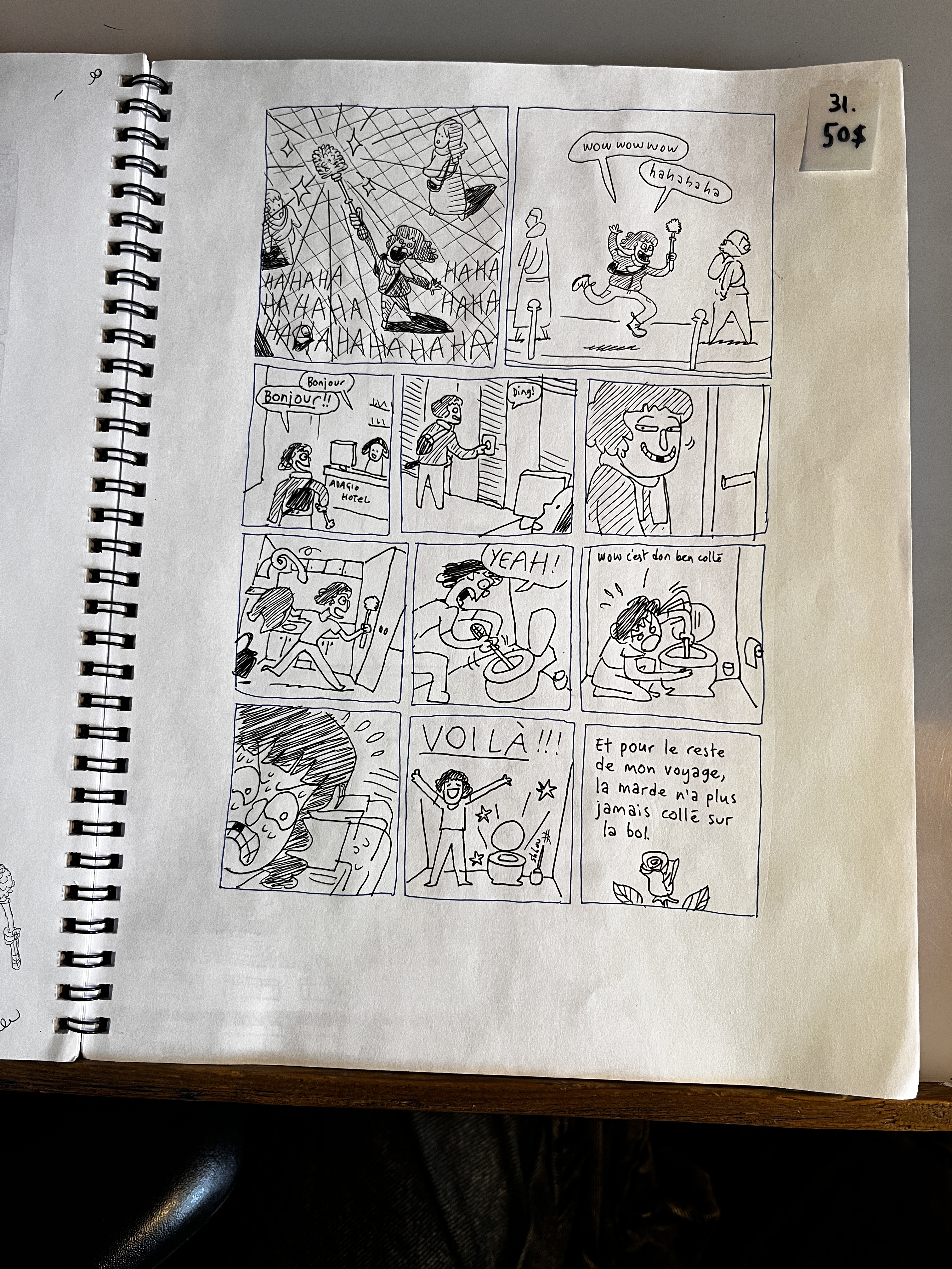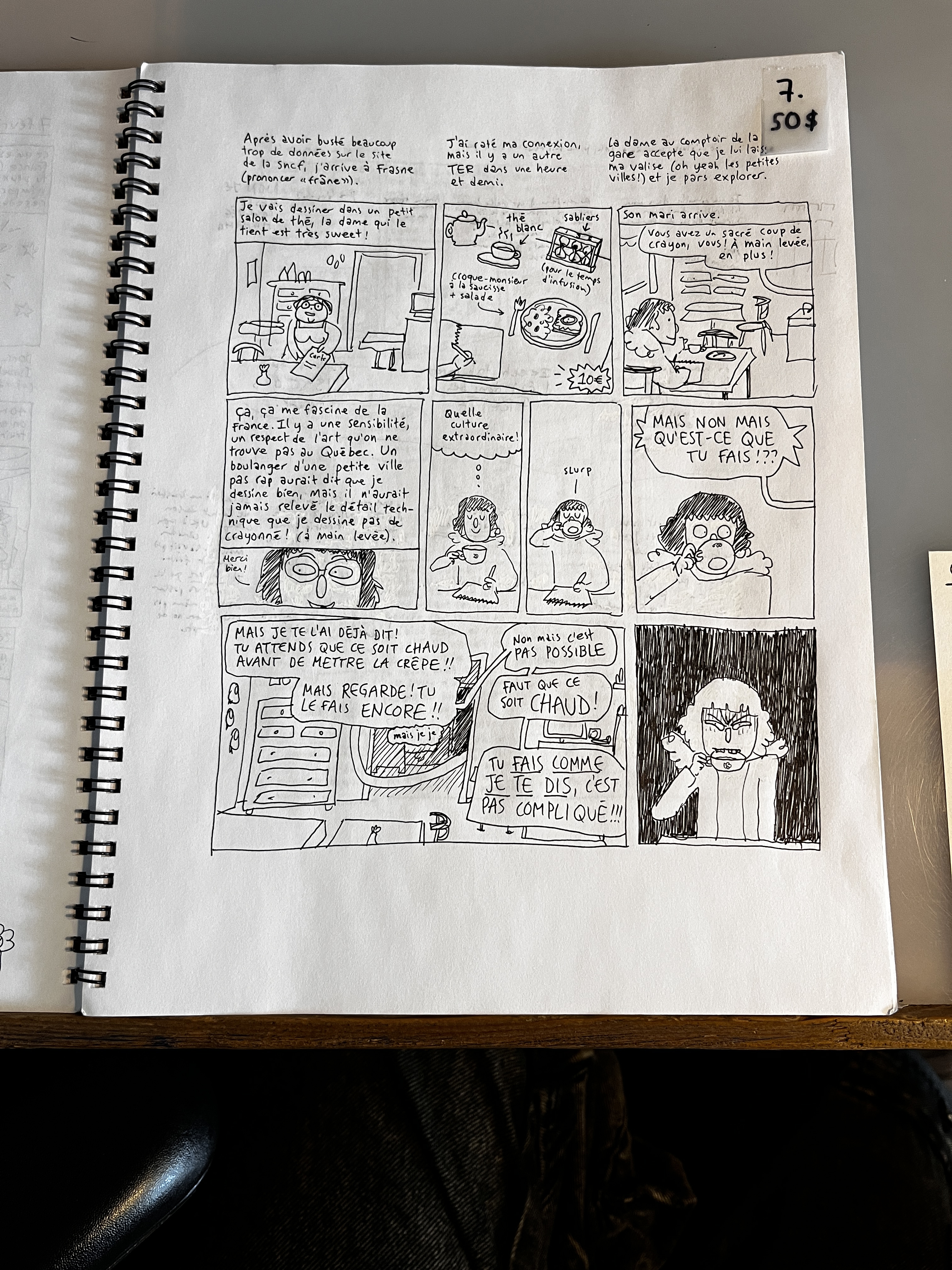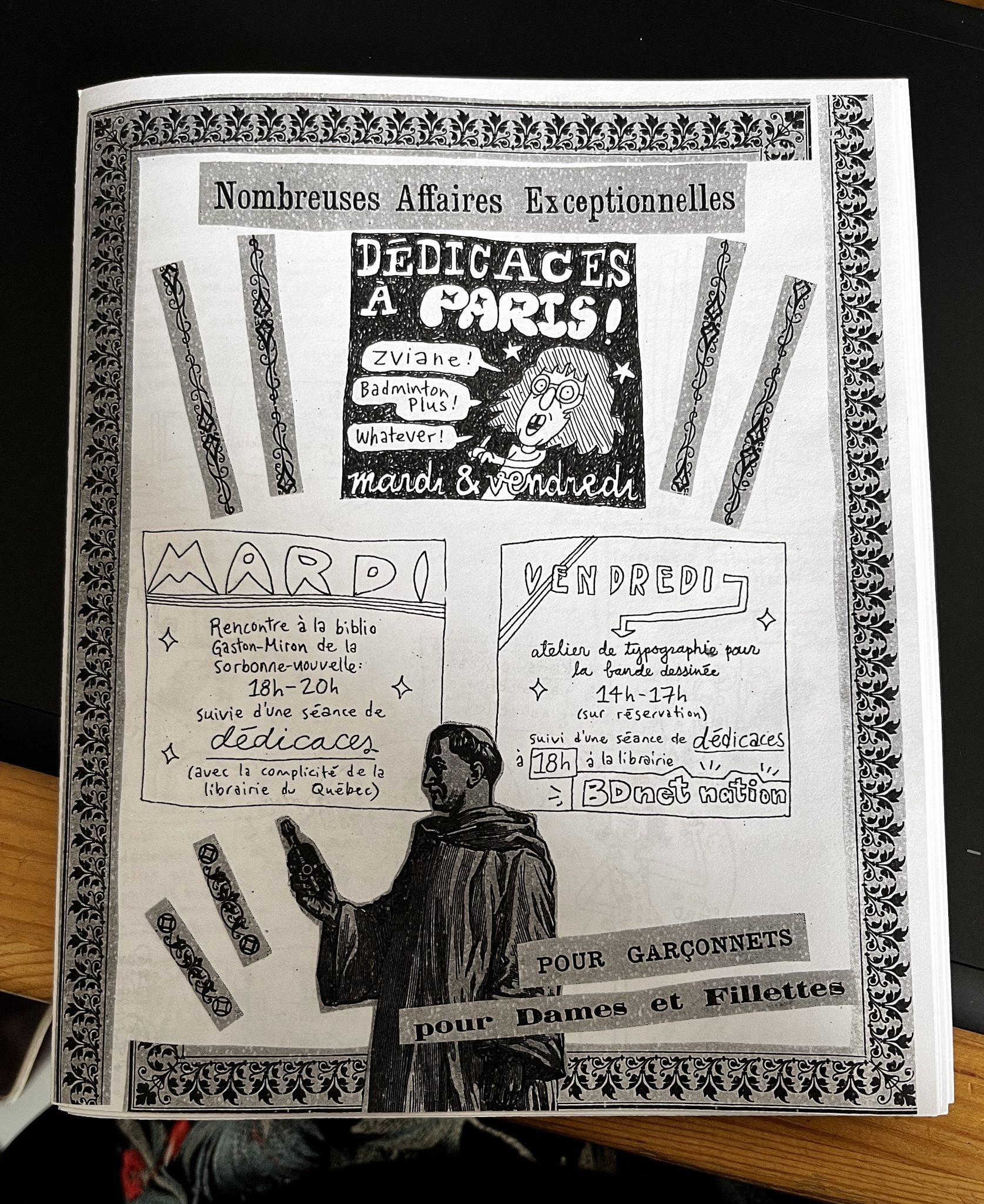 Mon projet de film a chié, donc je me suis remise à faire de la BD. Ça c'est mon journal de voyage quand j'étais à Paris. J'ai fait quelques pages aussi à Los Angeles, mais c'est plus des dessins, j'avais pas trop le temps de faire de BD. J'ai pogné toutes les pages de Paris et j'en ai fait un zine. Aucune page n'a été scannée, le zine est fait entièrement à la photocopieuse - pis j'ai collé des ornements que j'ai trouvé dans des vieilles affaires.