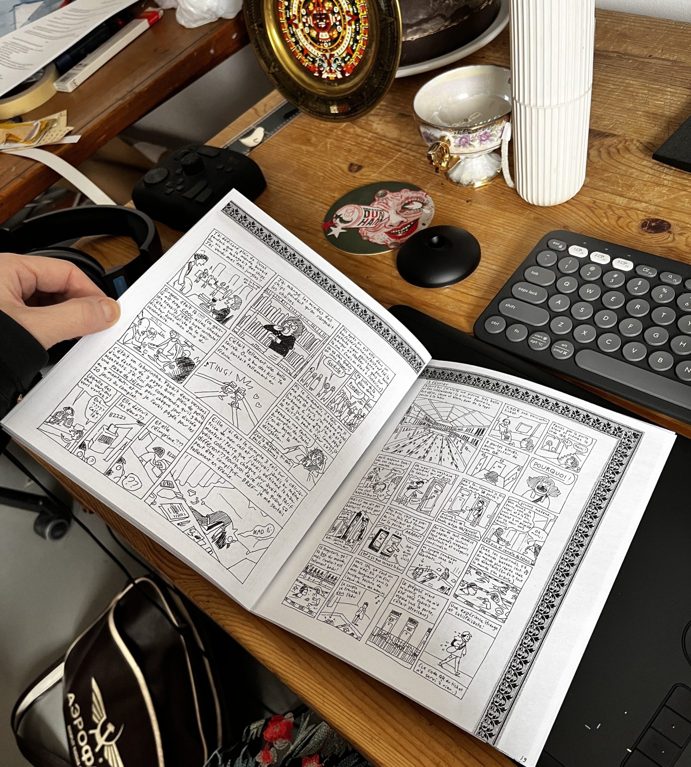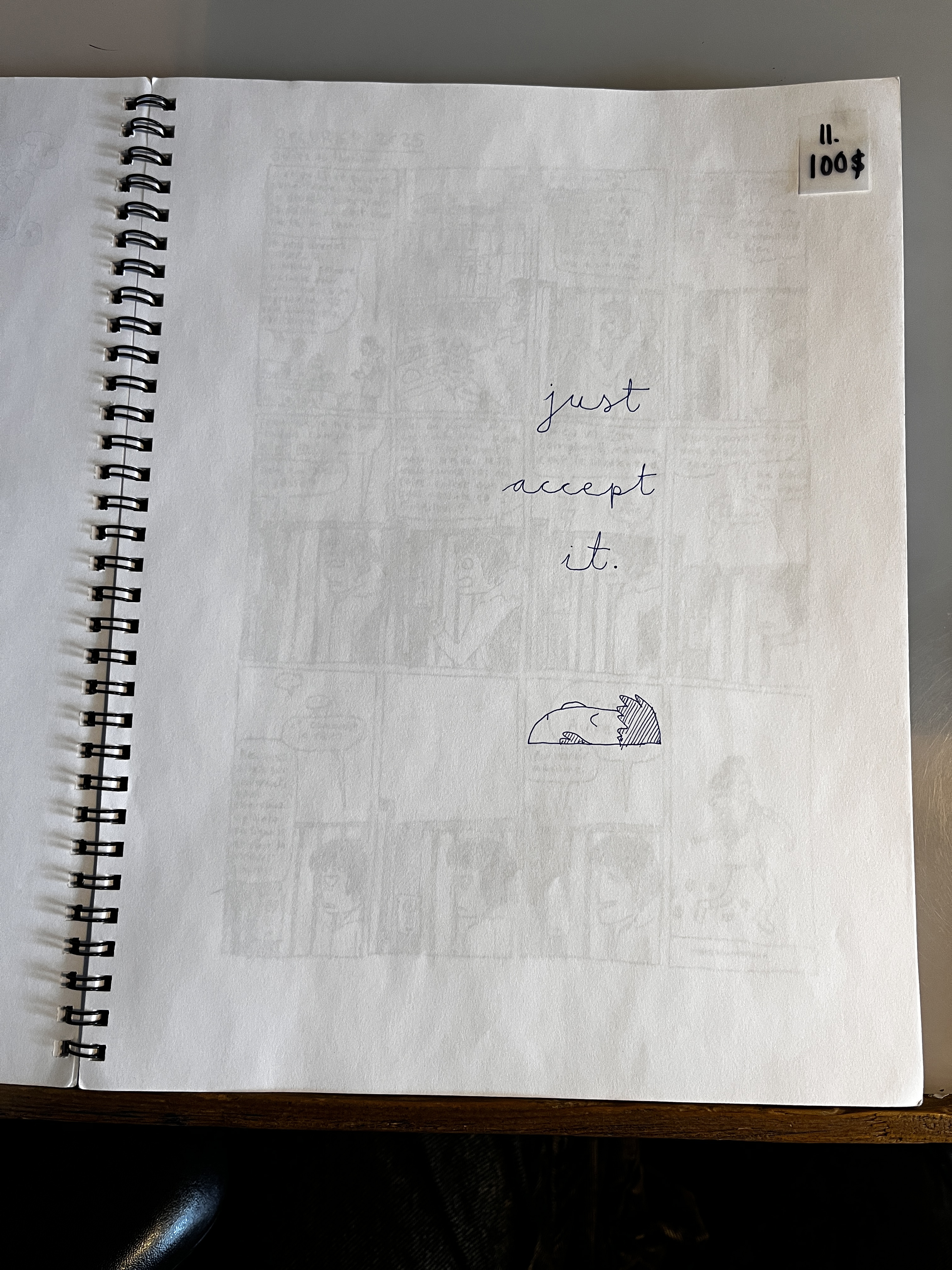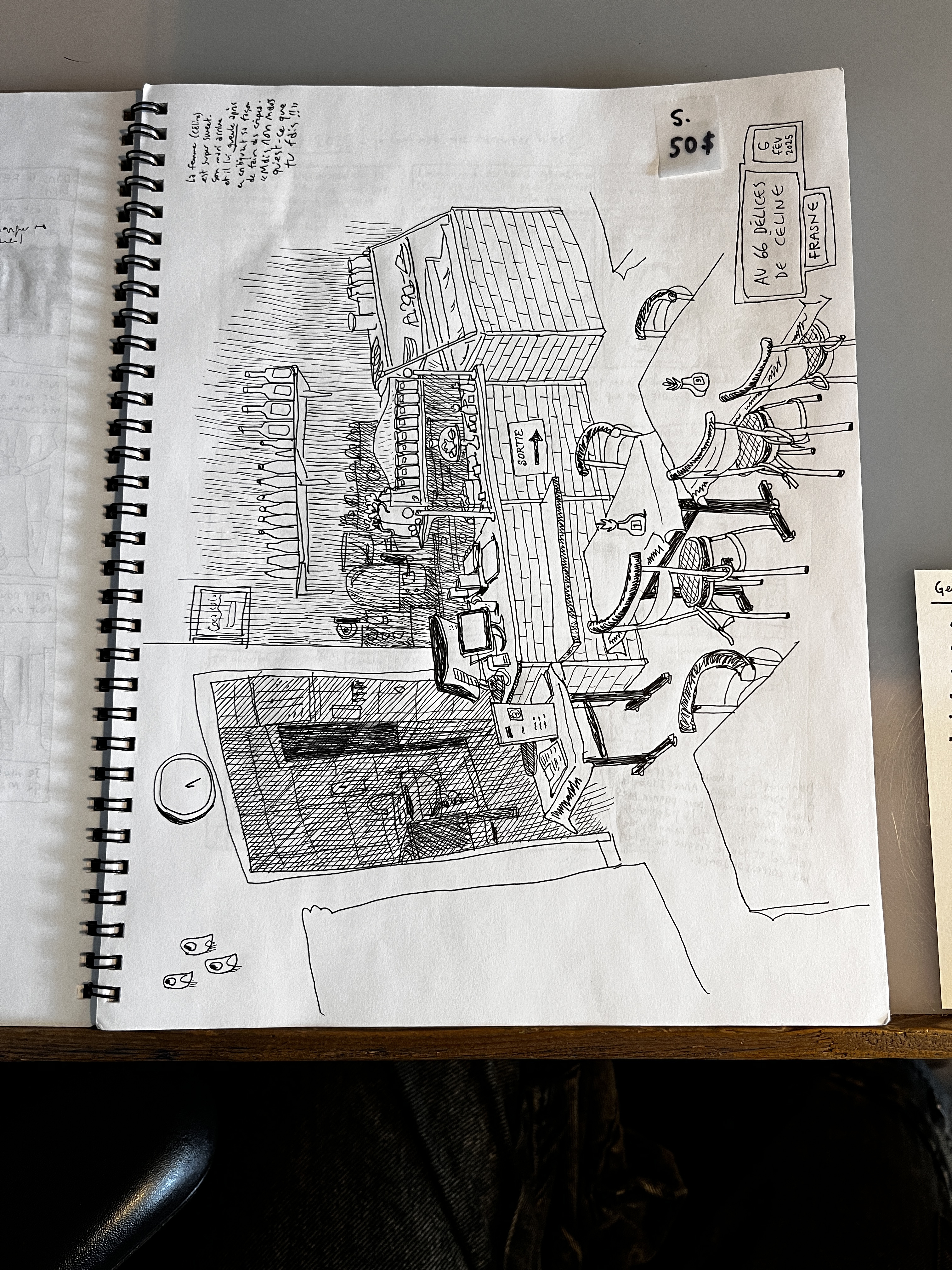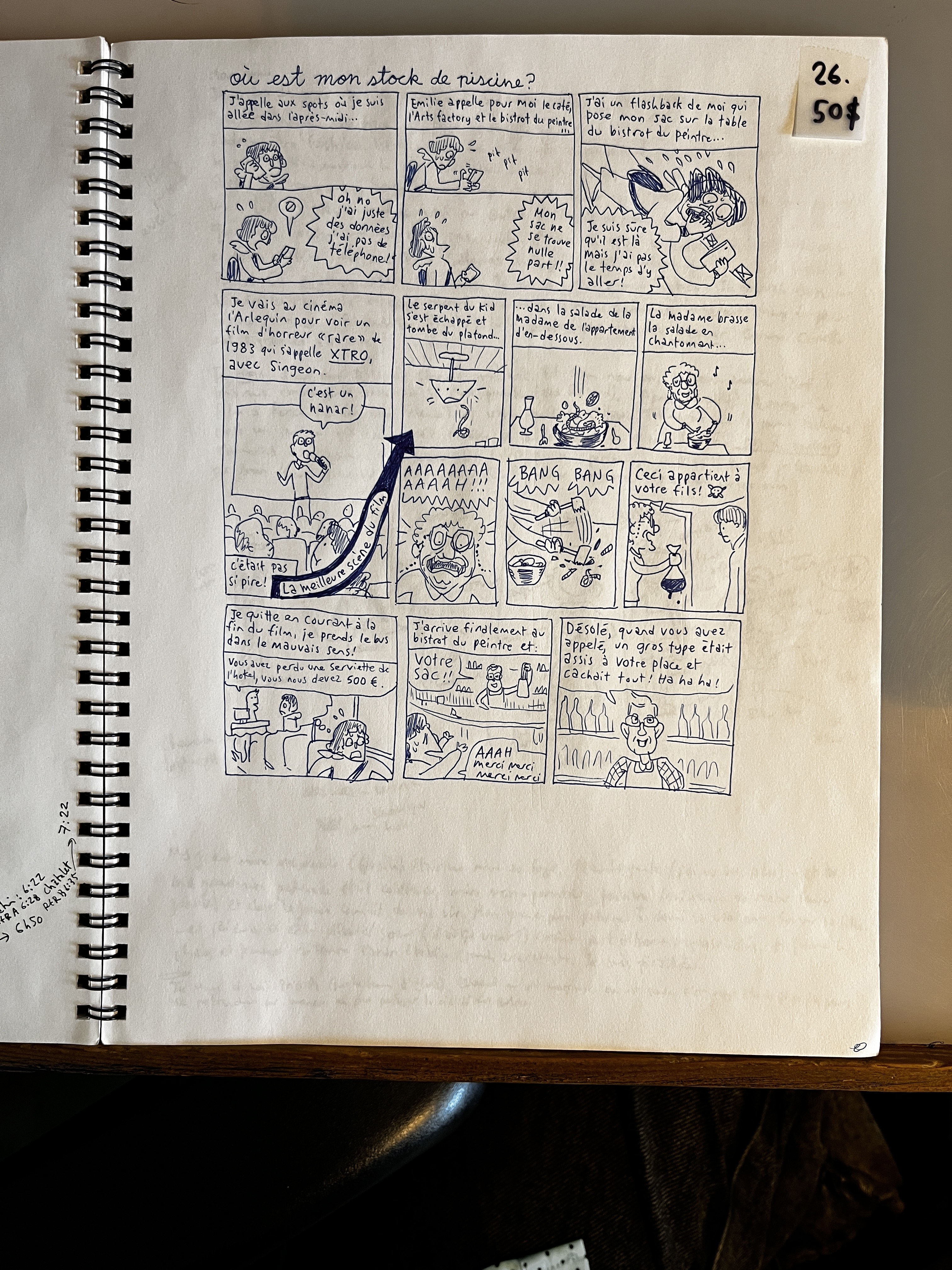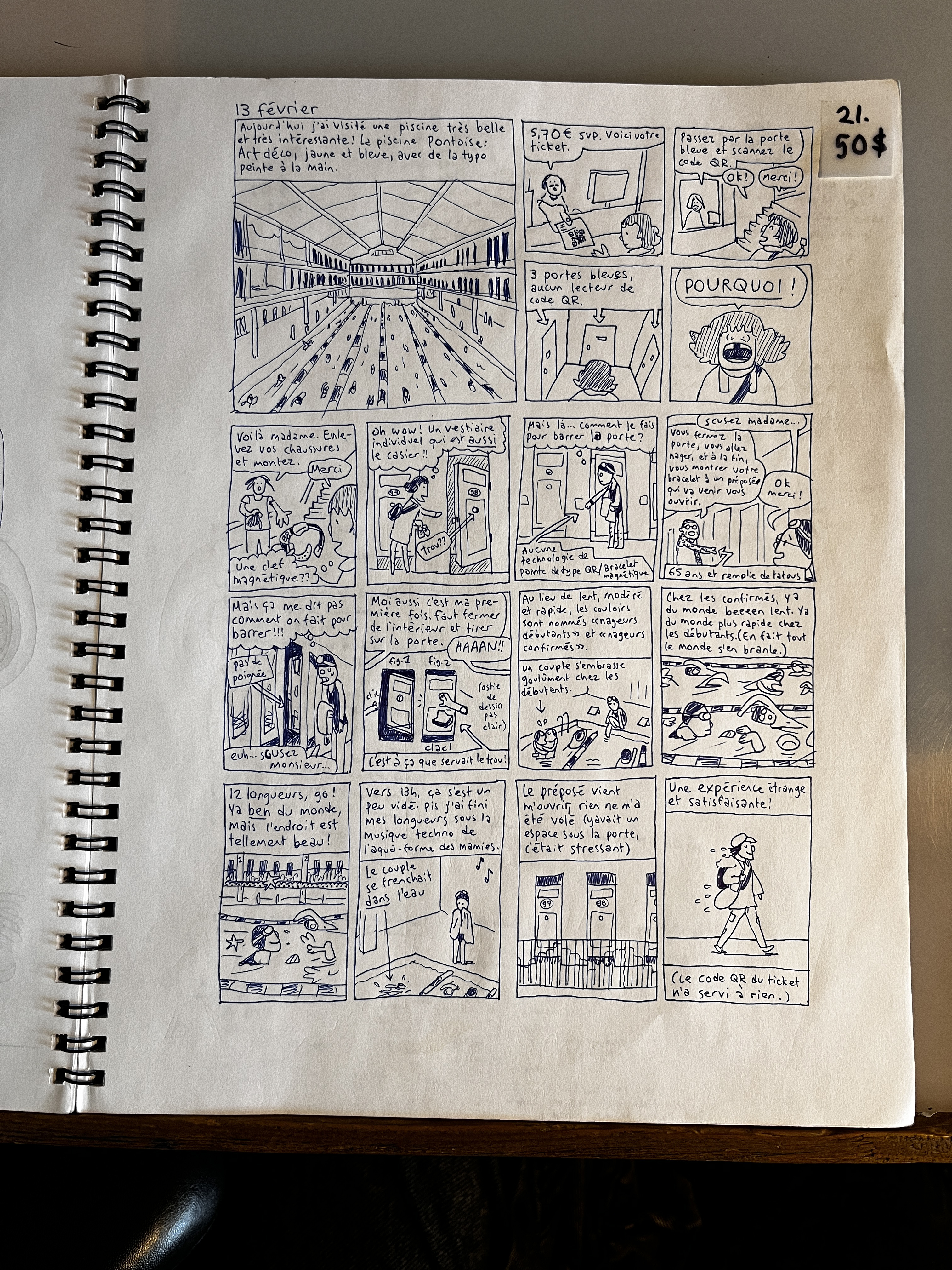 Mon projet de film a chié, donc je me suis remise à faire de la BD. Ça c'est mon journal de voyage quand j'étais à Paris. J'ai fait quelques pages aussi à Los Angeles, mais c'est plus des dessins, j'avais pas trop le temps de faire de BD. J'ai pogné toutes les pages de Paris et j'en ai fait un zine. Aucune page n'a été scannée, le zine est fait entièrement à la photocopieuse - pis j'ai collé des ornements que j'ai trouvé dans des vieilles affaires.